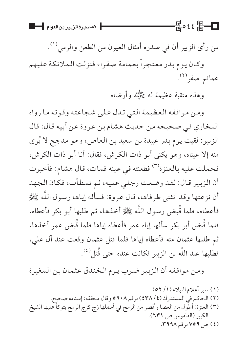 ومن مواقفه العظيمة التي تدل على شجاعته وقوته ما رواه البخاري في صحيحه من حديث هشام بن عروة عن أبيه قال: قال الزبير: لقيت يوم بدر عبيدة بن سعيد بن العاص، وهو مدجج لا يُرى منه إلا عيناه، وهو يكنى أبو ذات الكرش، فقال: أنا أبو ذات الكرش، فحملت عليه بالعنزة (¬٣) فطعنته في عينه فمات، قال هشام: فأخبرت أن الزبير قال: لقد وضعت رجلي عليه، ثم تمطأت، فكان الجهد أن نزعتها وقد انثنى طرفاها، قال عروة: فسأله إياها رسول اللَّه صلَّى اللهُ عليه وسلَّم فأعطاه، فلما قُبض رسول اللَّه صلَّى اللهُ عليه وسلَّم أخذها، ثم طلبها أبو بكر فأعطاه، فلما قُبض أبو بكر سألها إياه عمر فأعطاه إياها فلما قُبض عمر أخذها، ثم طلبها عثمان منه فأعطاه إياها فلما قتل عثمان وقعت عند آل علي، فطلبها عبد اللَّه بن الزبير فكانت عنده حتى قُتل (¬٤).