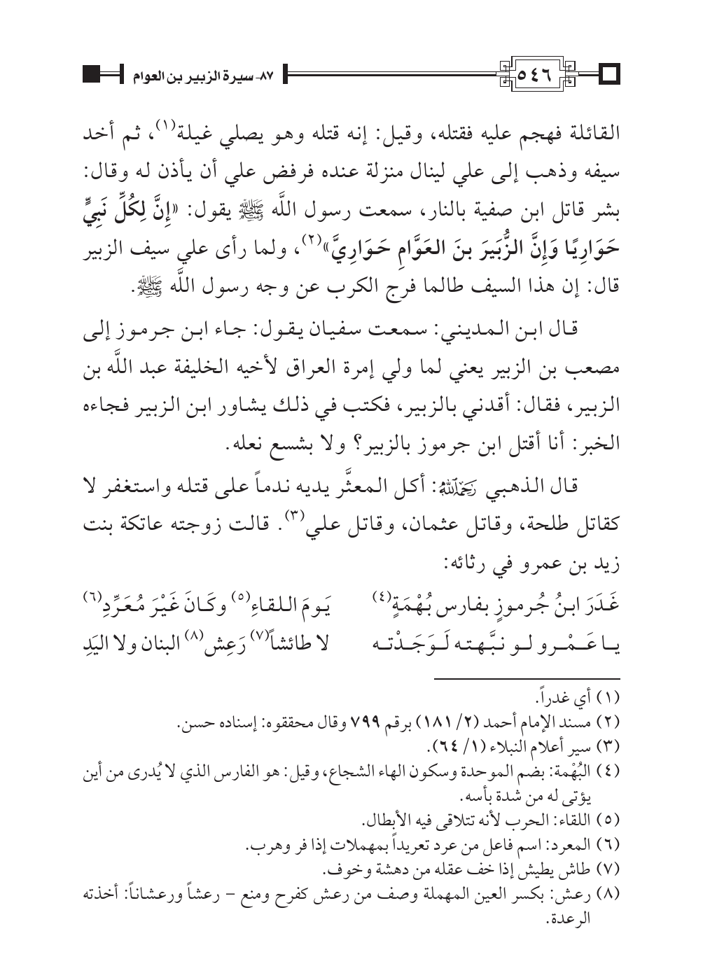القائلة فهجم عليه فقتله، وقيل: إنه قتله وهو يصلي غيلة (¬١)، ثم أخد سيفه وذهب إلى علي لينال منزلة عنده فرفض علي أن يأذن له وقال: بشر قاتل ابن صفية بالنار، سمعت رسول اللَّه صلَّى اللهُ عليه وسلَّم يقول: «إِنَّ لِكُلِّ نَبِيٍّ حَوَارِيًا وَإِنَّ الزُّبَيرَ بنَ العَوَّامِ حَوَارِيَّ» (¬٢)، ولما رأى علي سيف الزبير قال: إن هذا السيف طالما فرج الكرب عن وجه رسول اللَّه صلَّى اللهُ عليه وسلَّم.
