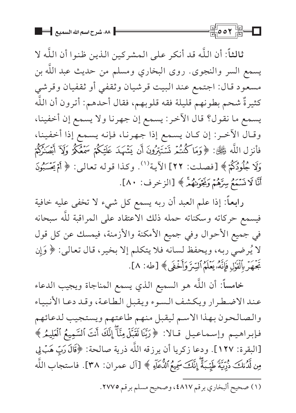 ثالثاً: أن اللَّه قد أنكر على المشركين الذين ظنوا أن اللَّه لا يسمع السر والنجوى. روى البخاري ومسلم من حديث عبد اللَّه بن مسعود قال: اجتمع عند البيت قرشيان وثقفي أو ثقفيان وقرشي كثيرةٌ شحم بطونهم قليلة فقه قلوبهم، فقال أحدهم: أترون أن اللَّه يسمع ما نقول؟ قال الآخر: يسمع إن جهرنا ولا يسمع إن أخفينا، وقال الآخر: إن كان يسمع إذا جهرنا، فإنه يسمع إذا أخفينا، فأنزل اللَّه عزَّ وجلَّ: {وَمَا كُنتُمْ تَسْتَتِرُونَ أَنْ يَشْهَدَ عَلَيْكُمْ سَمْعُكُمْ وَلَا أَبْصَارُكُمْ وَلَا جُلُودُكُمْ} [فصلت: ٢٢] الآية (¬١). وكذا قوله تعالى: {أَمْ يَحْسَبُونَ أَنَّا لَا نَسْمَعُ سِرَّهُمْ وَنَجْوَاهُم} [الزخرف: ٨٠].