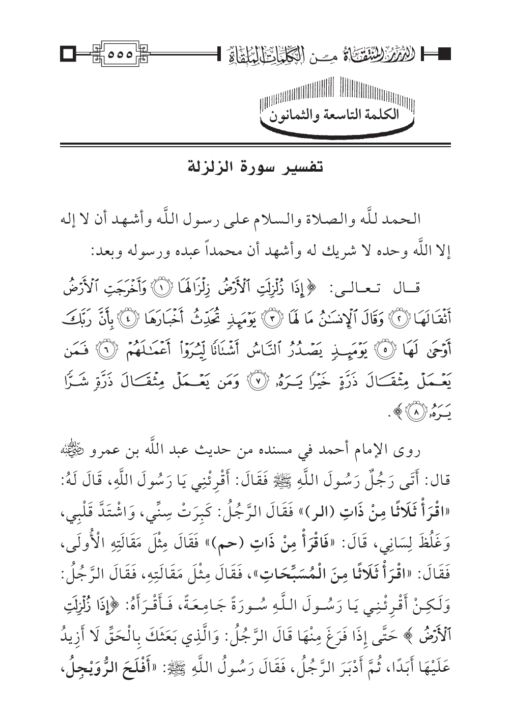 روى الإمام أحمد في مسنده من حديث عبد اللَّه بن عمرو رضي اللهُ عنه قال: أَتَى رَجُلٌ رَسُولَ اللَّهِ صلَّى اللهُ عليه وسلَّم فَقَالَ: أَقْرِئْنِي يَا رَسُولَ اللَّهِ، قَالَ لَهُ: «اقْرَا ثَلَاثًا مِنْ ذَاتِ (الر)» فَقَالَ الرَّجُلُ: كَبِرَتْ سِنِّي، وَاشْتَدَّ قَلْبِي، وَغَلُظَ لِسَانِي، قَالَ: «فَاقْرَا مِنْ ذَاتِ (حم)» فَقَالَ مِثْلَ مَقَالَتِهِ الْأُولَى، فَقَالَ: «اقْرَا ثَلَاثًا مِنَ الْمُسَبِّحَاتِ»، فَقَالَ مِثْلَ مَقَالَتِهِ، فَقَالَ الرَّجُلُ: وَلَكِنْ أَقْرِئْنِي يَا رَسُولَ اللَّهِ سُورَةً جَامِعَةً، فَأَقْرَأَهُ: {إِذَا زُلْزِلَتِ الأَرْضُ} حَتَّى إِذَا فَرَغَ مِنْهَا قَالَ الرَّجُلُ: وَالَّذِي بَعَثَكَ بِالْحَقِّ لَا أَزِيدُ عَلَيْهَا أَبَدًا، ثُمَّ أَدْبَرَ الرَّجُلُ، فَقَالَ رَسُولُ اللَّهِ صلَّى اللهُ عليه وسلَّم: «أَفْلَحَ الرُّوَيْجِلُ،