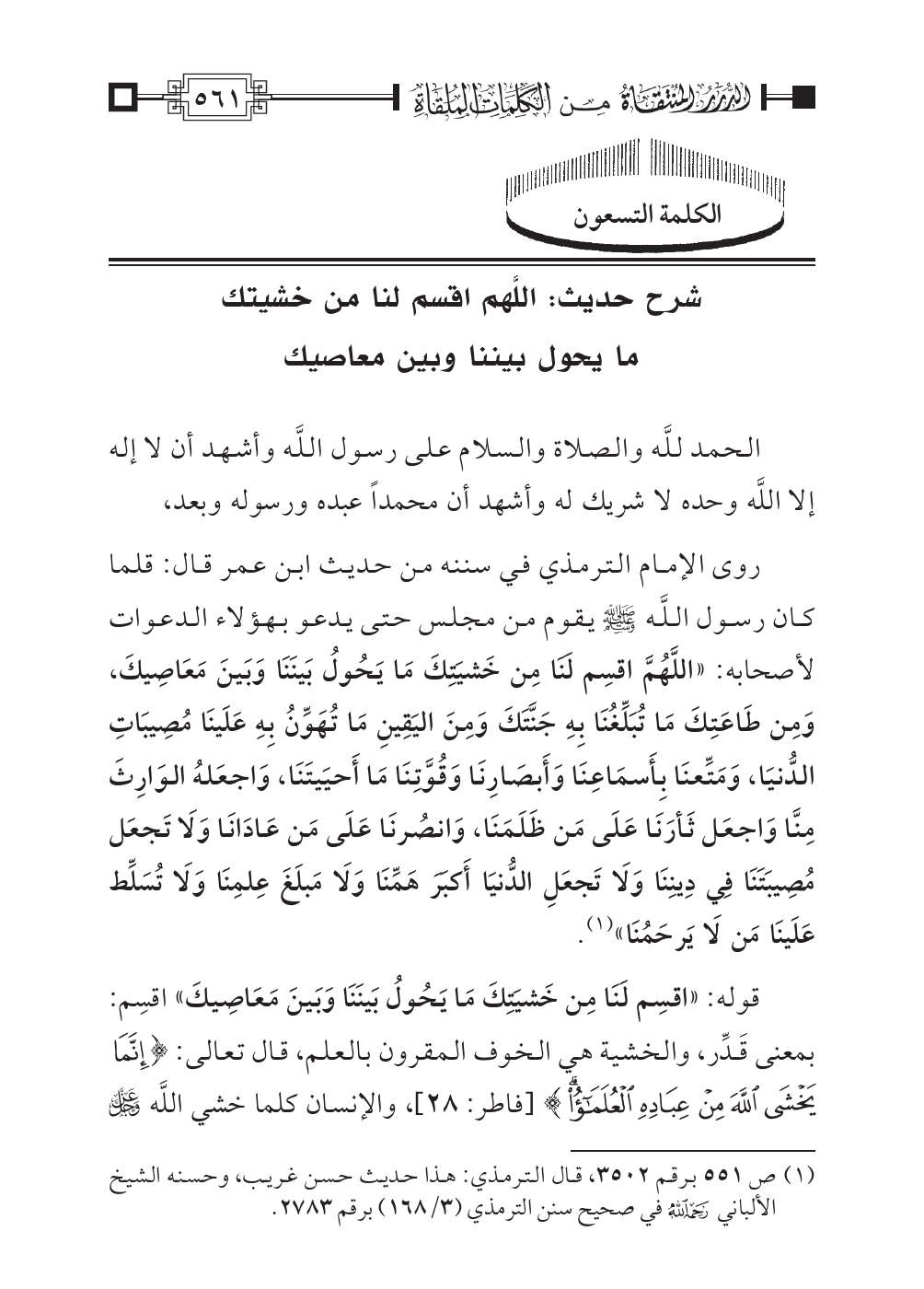 الكلمة التسعون: شرح حديث: «اللَّهم اقسم لنا من خشيتك ما يحول بيننا وبين معاصيك»
