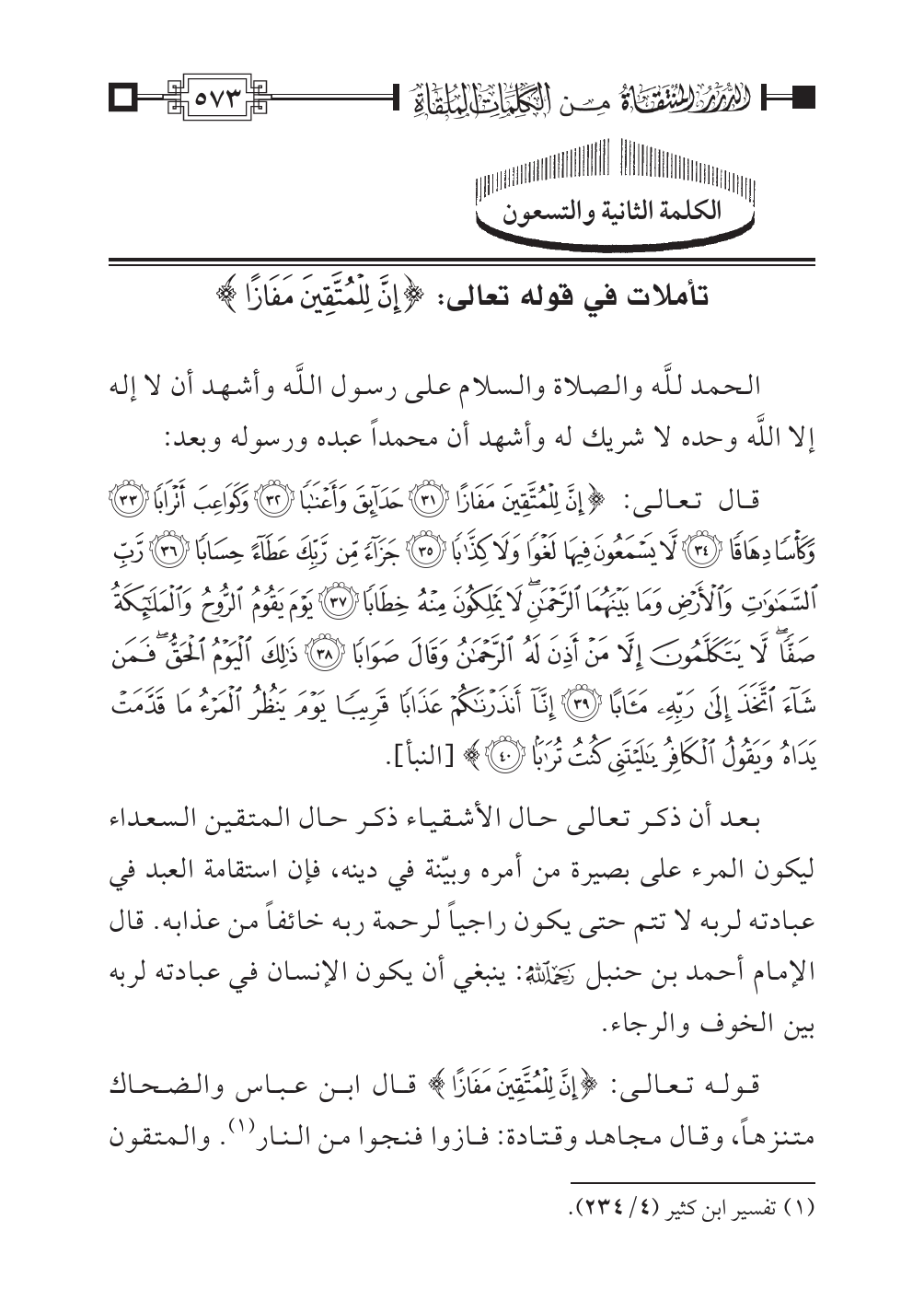 الكلمة الثانية والتسعون: تأملات في قوله تعالى: {إِنَّ لِلْمُتَّقِينَ مَفَازًا}