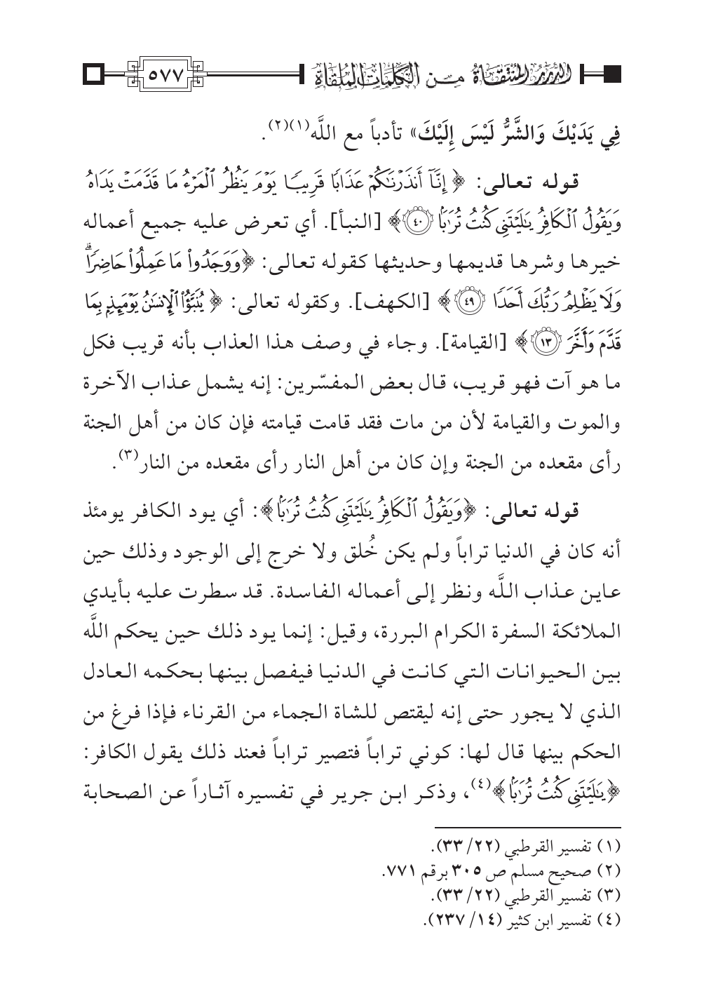 قوله تعالى: {إِنَّا أَنذَرْنَاكُمْ عَذَابًا قَرِيبًا يَوْمَ يَنظُرُ الْمَرْءُ مَا قَدَّمَتْ يَدَاهُ وَيَقُولُ الْكَافِرُ يَالَيْتَنِي كُنتُ تُرَابًا (٤٠)} [النبأ]. أي تعرض عليه جميع أعماله خيرها وشرها قديمها وحديثها كقوله تعالى: {وَوَجَدُوا مَا عَمِلُوا حَاضِرًا وَلَا يَظْلِمُ رَبُّكَ أَحَدًا (٤٩)} [الكهف]. وكقوله تعالى: {يُنَبَّأُ الإِنسَانُ يَوْمَئِذٍ بِمَا قَدَّمَ وَأَخَّر (١٣)} [القيامة]. وجاء في وصف هذا العذاب بأنه قريب فكل ما هو آت فهو قريب، قال بعض المفسّرين: إنه يشمل عذاب الآخرة والموت والقيامة لأن من مات فقد قامت قيامته فإن كان من أهل الجنة رأى مقعده من الجنة وإن كان من أهل النار رأى مقعده من النار (¬٣).