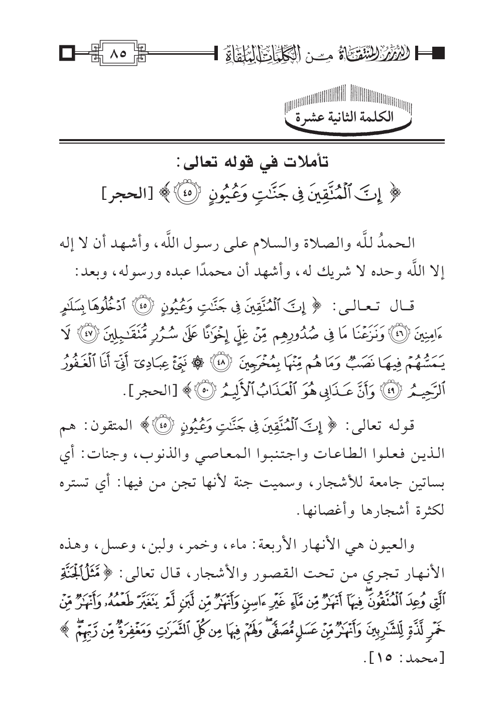 الكلمة الثانية عشرة: تأملات في قوله تعالى: {إِنَّ الْمُتَّقِينَ فِي جَنَّاتٍ وَعُيُون} [الحجر]