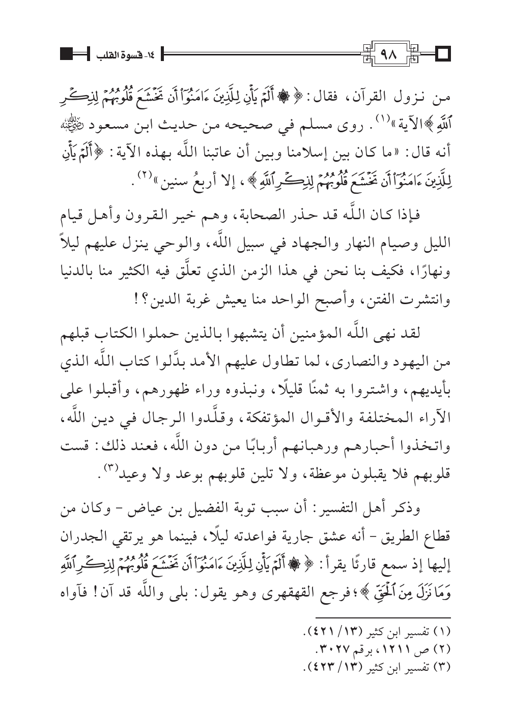 من نزول القرآن، فقال: {أَلَمْ يَأنِ لِلَّذِينَ آمَنُوا أَن تَخْشَعَ قُلُوبُهُمْ لِذِكْرِ اللَّهِ} الآية» (¬١). روى مسلم في صحيحه من حديث ابن مسعود رضي اللهُ عنه أنه قال: «ما كان بين إسلامنا وبين أن عاتبنا اللَّه بهذه الآية: {أَلَمْ يَأنِ لِلَّذِينَ آمَنُوا أَن تَخْشَعَ قُلُوبُهُمْ لِذِكْرِ اللَّهِ}، إلا أربعُ سنين» (¬٢).