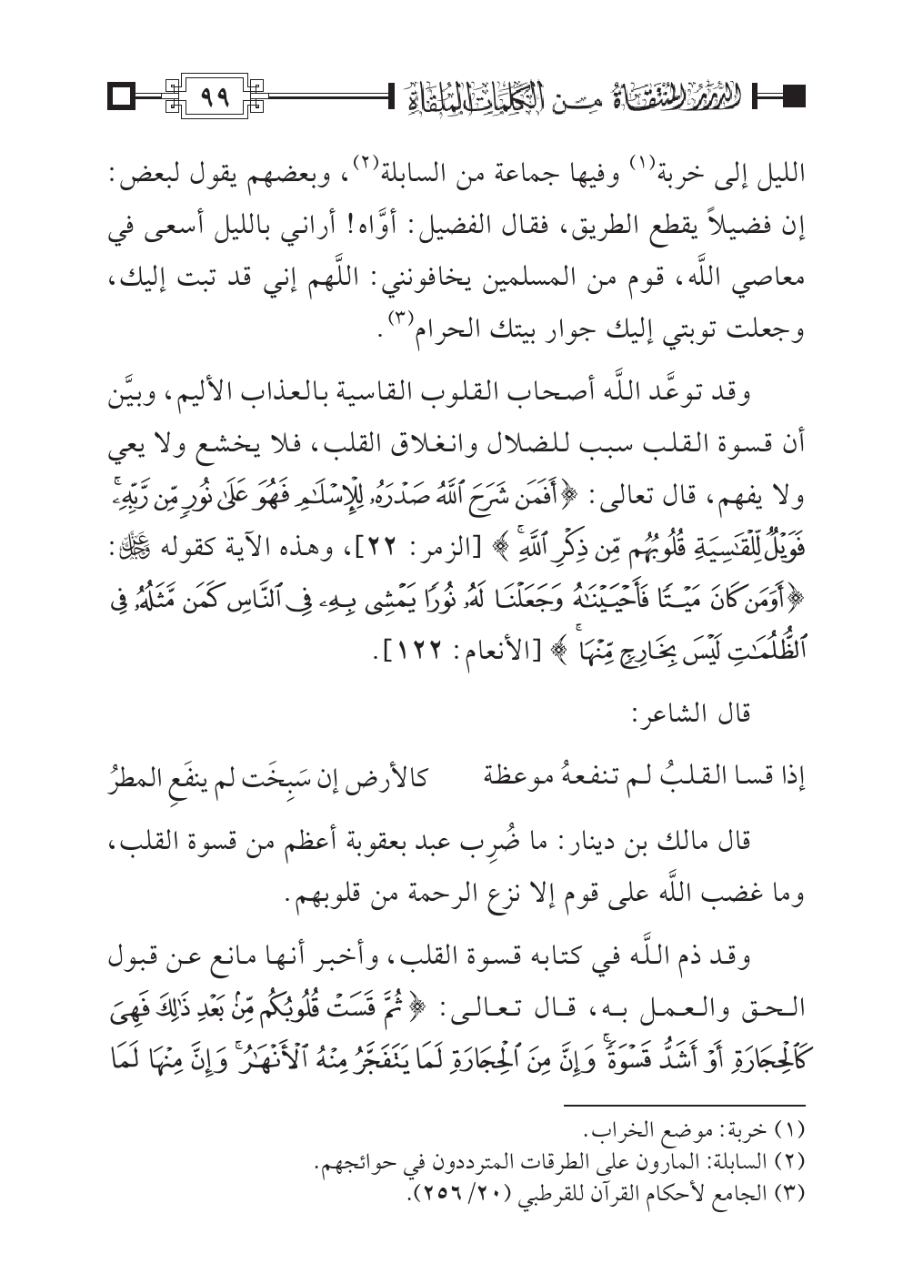 وقد توعَّد اللَّه أصحاب القلوب القاسية بالعذاب الأليم، وبيَّن أن قسوة القلب سبب للضلال وانغلاق القلب، فلا يخشع ولا يعي ولا يفهم، قال تعالى: {أَفَمَن شَرَحَ اللَّهُ صَدْرَهُ لِلإِسْلَامِ فَهُوَ عَلَى نُورٍ مِّن رَّبِّهِ فَوَيْلٌ لِّلْقَاسِيَةِ قُلُوبُهُم مِّن ذِكْرِ اللَّهِ} [الزمر: ٢٢]، وهذه الآية كقوله عزَّ وجلَّ: {أَوَ مَن كَانَ مَيْتًا فَأَحْيَيْنَاهُ وَجَعَلْنَا لَهُ نُورًا يَمْشِي بِهِ فِي النَّاسِ كَمَن مَّثَلُهُ فِي الظُّلُمَاتِ لَيْسَ بِخَارِجٍ مِّنْهَا} [الأنعام: ١٢٢].