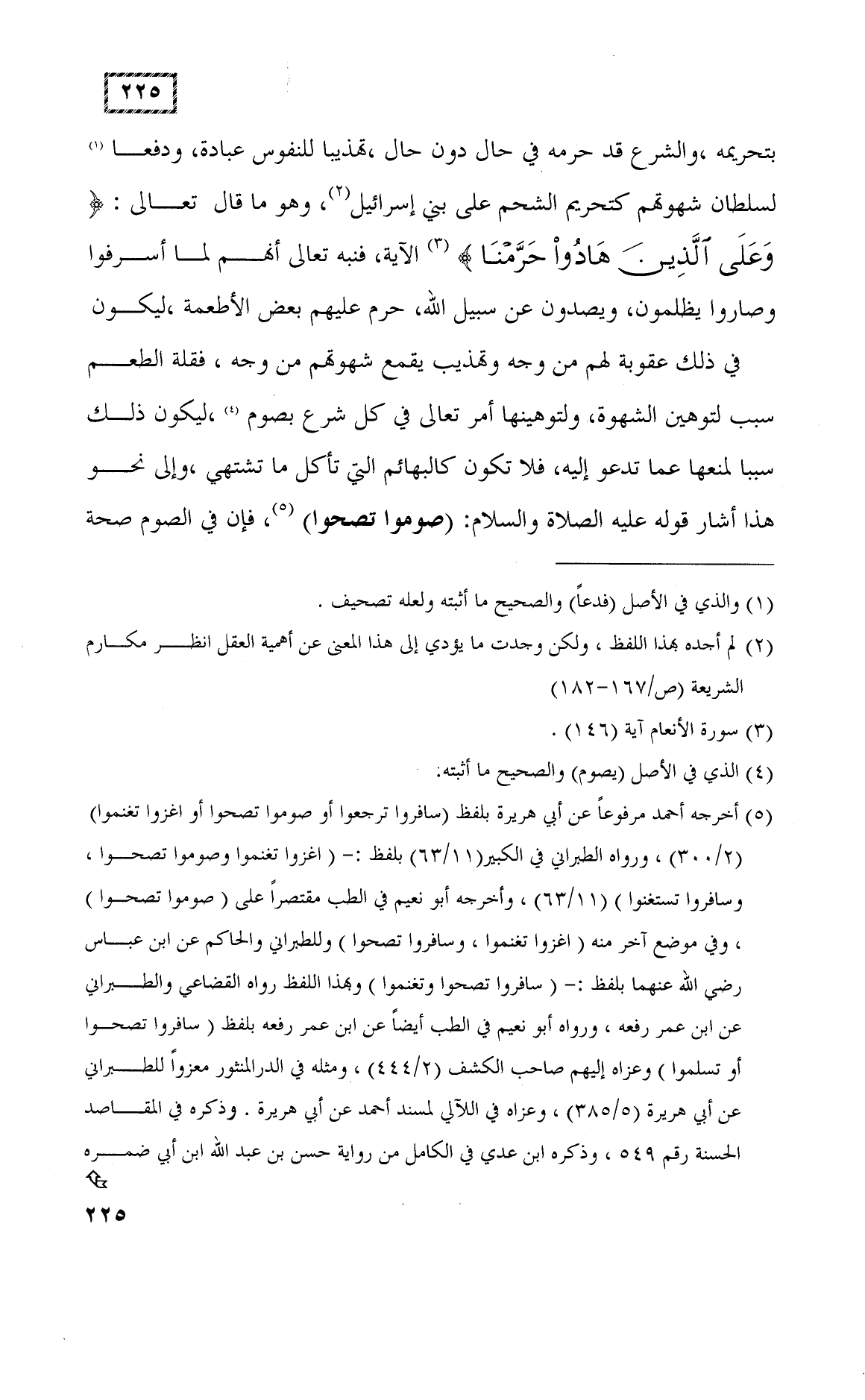 وصاروا يظلمون، ويصدون عن سبيل الله، حرم عليهم بعض الأطعمة، ليكون في ذلك عقوبة لهم من وجه وتهذيب يقمع شهوتهم من وجه، فقلة الطعم سبب لتوهين الشهوة، ولتوهينها أمر تعالى في كل شرع بصوم، ليكون ذلك سببا لمنعها عما تدعو إليه، فلا تكون كالبهائم التي تأكل ما تشتهي، وإلى نحو هذا أشار قوله عليه الصلاة والسلام: (صوموا تصحوا)، فإن في الصوم صحة