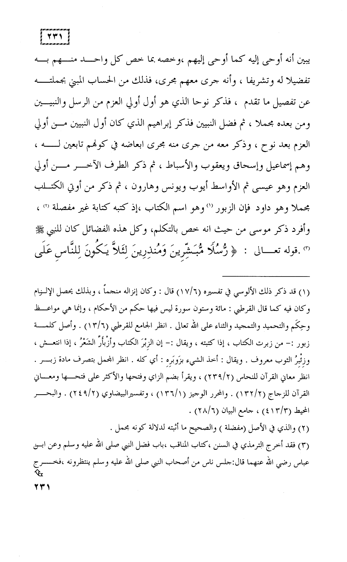 ومن بعده مجملا، ثم فضل النبيين فذكر إبراهيم الذي كان أول النبيين من أولي العزم بعد نوح، وذكر معه من جرى منه مجرى أبعاضه في كونهم تابعين له، وهم إسماعيل وإسحاق ويعقوب والأسباط، ثم ذكر الطرف الآخر من أولي العزم وهو عيسى ثم الأواسط أيوب ويونس وهارون، ثم ذكر من أوتي الكتاب مجملا وهو داوود، فإن الزبور وهو اسم الكتاب، إذ كتبه كتابة غير مفصلة، وأفرد ذكر موسى من حيث إنه خص بالتكلم، وكل هذه الفضائل كان للنبي - صلى الله عليه وسلم -.