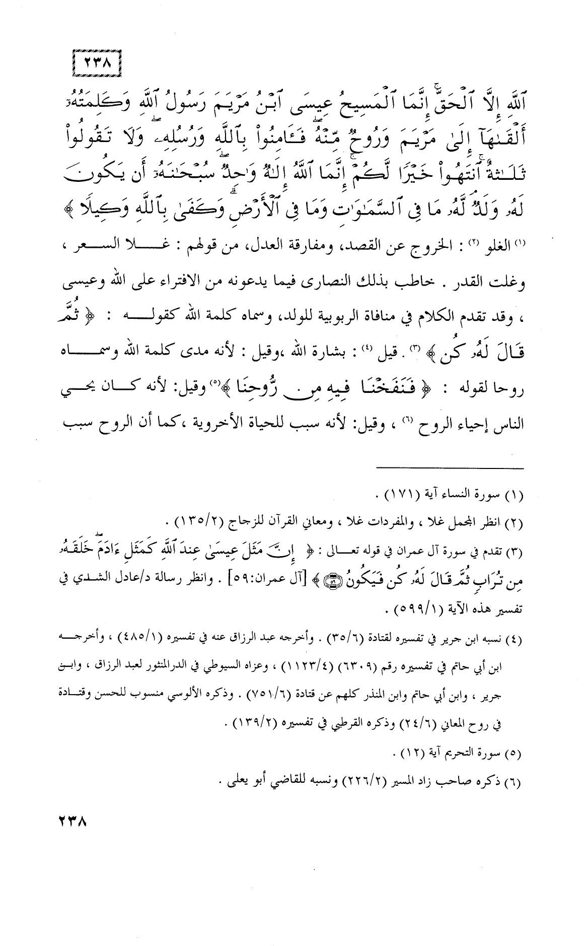 يَا أَهْلَ الْكِتَابِ لَا تَغْلُوا فِي دِينِكُمْ وَلَا تَقُولُوا عَلَى اللَّهِ إِلَّا الْحَقَّ إِنَّمَا الْمَسِيحُ عِيسَى ابْنُ مَرْيَمَ رَسُولُ اللَّهِ وَكَلِمَتُهُ أَلْقَاهَا إِلَى مَرْيَمَ وَرُوحٌ مِنْهُ فَآمِنُوا بِاللَّهِ وَرُسُلِهِ وَلَا تَقُولُوا ثَلَاثَةٌ انْتَهُوا خَيْرًا لَكُمْ إِنَّمَا اللَّهُ إِلَهٌ وَاحِدٌ سُبْحَانَهُ أَنْ يَكُونَ لَهُ وَلَدٌ لَهُ مَا فِي السَّمَاوَاتِ وَمَا فِي الْأَرْضِ وَكَفَى بِاللَّهِ وَكِيلًا (171)
