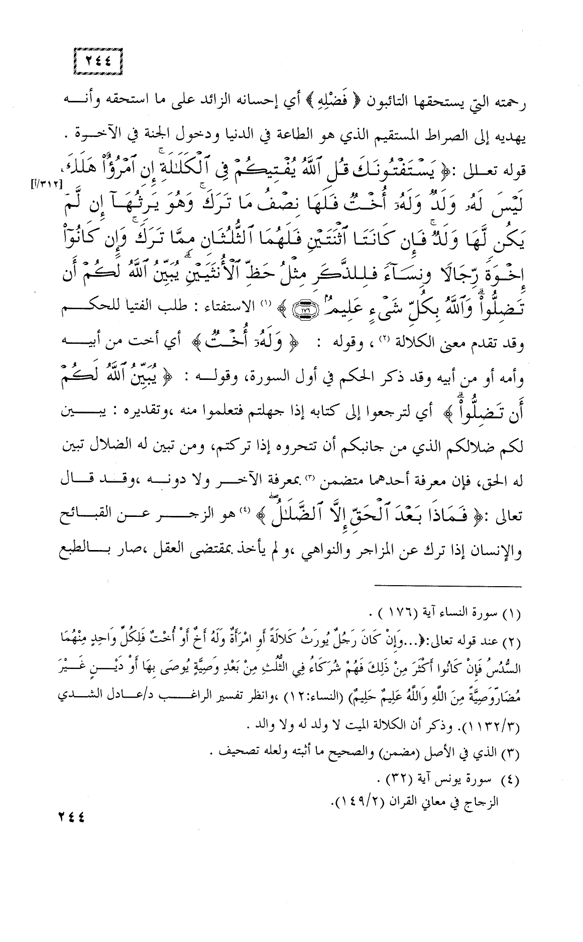 قوله تعالى: (يَسْتَفْتُونَكَ قُلِ اللَّهُ يُفْتِيكُمْ فِي الْكَلَالَةِ إِنِ امْرُؤٌ هَلَكَ لَيْسَ لَهُ وَلَدٌ وَلَهُ أُخْتٌ فَلَهَا نِصْفُ مَا تَرَكَ وَهُوَ يَرِثُهَا إِنْ لَمْ يَكُنْ لَهَا وَلَدٌ فَإِنْ كَانَتَا اثْنَتَيْنِ فَلَهُمَا الثُّلُثَانِ مِمَّا تَرَكَ وَإِنْ كَانُوا إِخْوَةً رِجَالًا وَنِسَاءً فَلِلذَّكَرِ مِثْلُ حَظِّ الْأُنْثَيَيْنِ يُبَيِّنُ اللَّهُ لَكُمْ أَنْ تَضِلُّوا وَاللَّهُ بِكُلِّ شَيْءٍ عَلِيمٌ (176)