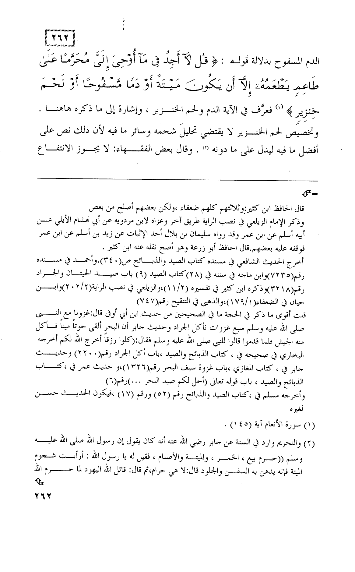الدم المسفوح بدلالة قوله (قُلْ لَا أَجِدُ فِي مَا أُوحِيَ إِلَيَّ مُحَرَّمًا عَلَى طَاعِمٍ يَطْعَمُهُ إِلَّا أَنْ يَكُونَ مَيْتَةً أَوْ دَمًا مَسْفُوحًا أَوْ لَحْمَ خِنْزِيرٍ) فعرَّف في الآية الدم ولحم الخنزير، وإشارة إلى ما ذكره هاهنا.