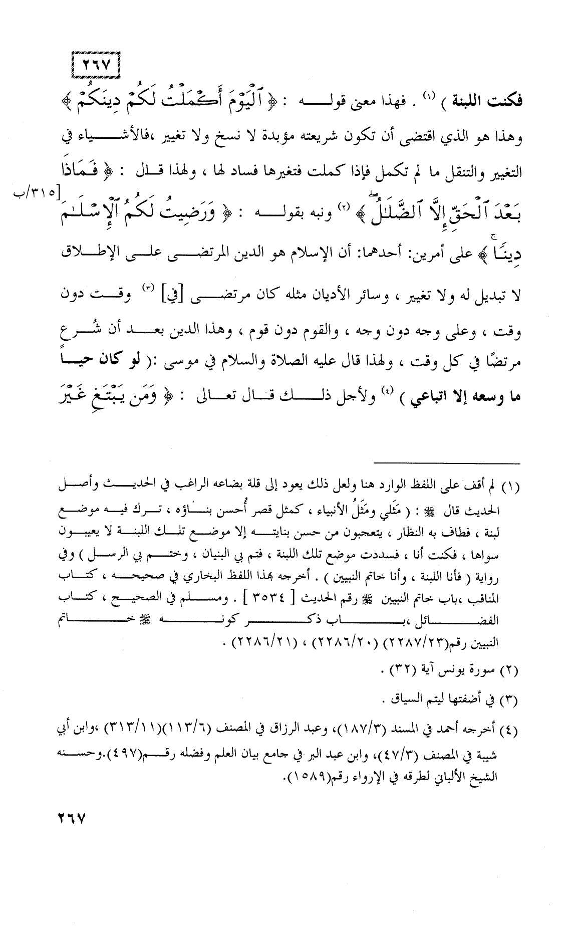 وهذا هو الذي اقتضى أن تكون شريعته مؤبدة لا نسخ ولا تغيير، فالأشياء في التغيير والتنقل ما لم تكمل فإذا كملت فتغيرها فساد لها، ولهذا قال: (فَمَاذَا بَعْدَ الْحَقِّ إِلَّا الضَّلَالُ) ونبه بقوله: (وَرَضِيتُ لَكُمُ الْإِسْلَامَ دِينًا)