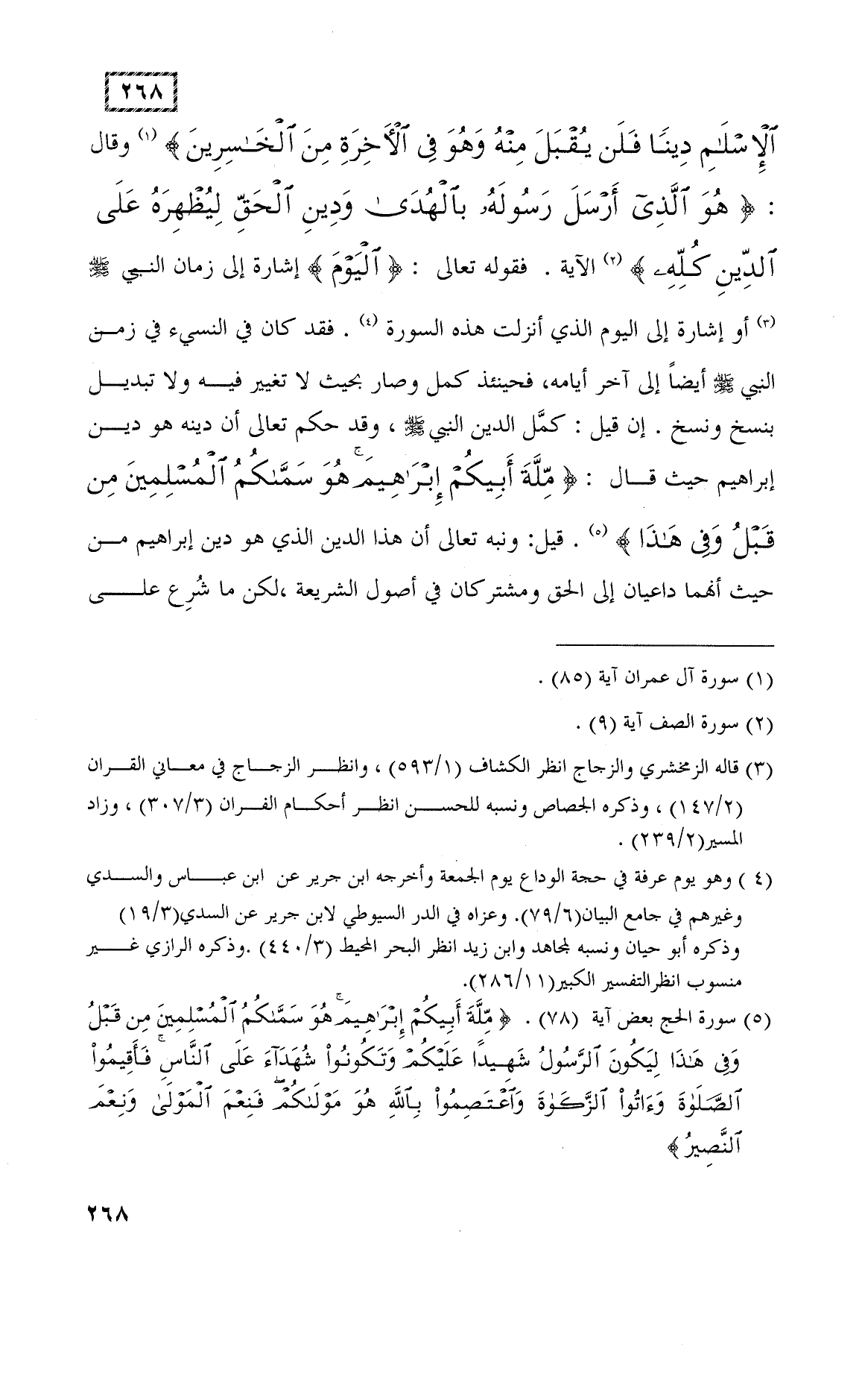 إن قيل: كمَّل الدين النبي - صلى الله عليه وسلم -، وقد حكم تعالى أن دينه هو دين إبراهيم حيث قال: (مِلَّةَ أَبِيكُمْ إِبْرَاهِيمَ هُوَ سَمَّاكُمُ الْمُسْلِمِينَ مِنْ قَبْلُ وَفِي هَذَا). قيل: ونبه تعالى أن هذا الدين الذي هو دين إبراهيم من