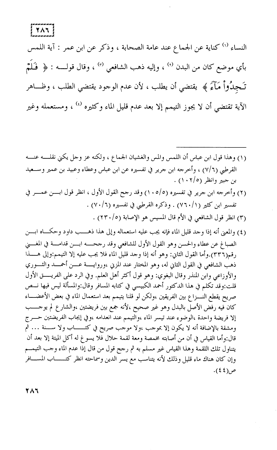 وملامسة النساء كناية عن الجماع عند عامة الصحابة، وذكر عن ابن عمر: آية اللمس بأي موضع كان من البدن، وإليه ذهب الشافعي، وقال قوله: (فَلَمْ تَجِدُوا مَاءً) يقتضي أن يطلب، لأن عدم الوجود يقتضي الطلب، وظاهر