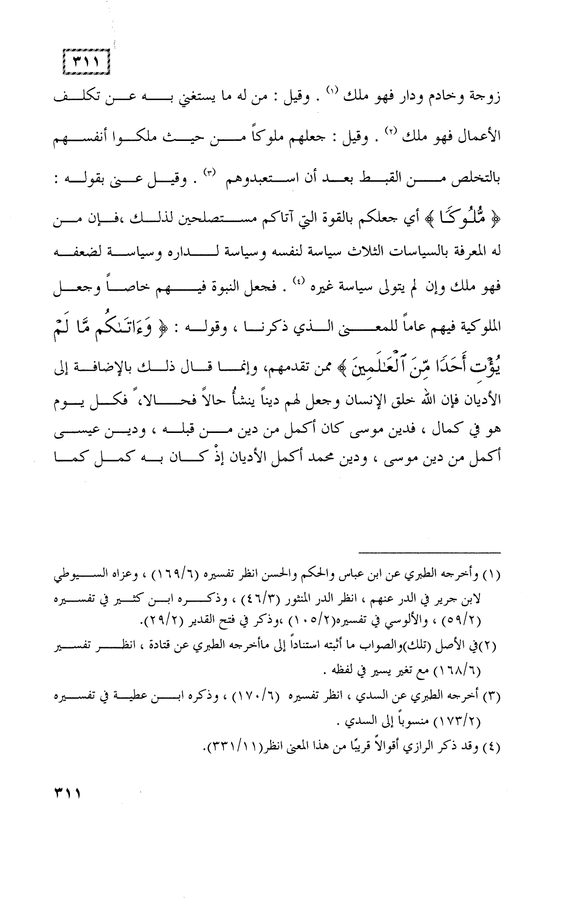 وقيل عنى بقوله: (مُّلُوكًا) أي جعلكم بالقوة التي آتاكم مستصلحين لذلك، فإن من له المعرفة بالسياسات الثلاث سياسة لنفسه وسياسة لداره وسياسة لضعفه فهو ملك وإن لم يتولى سياسة غيره.