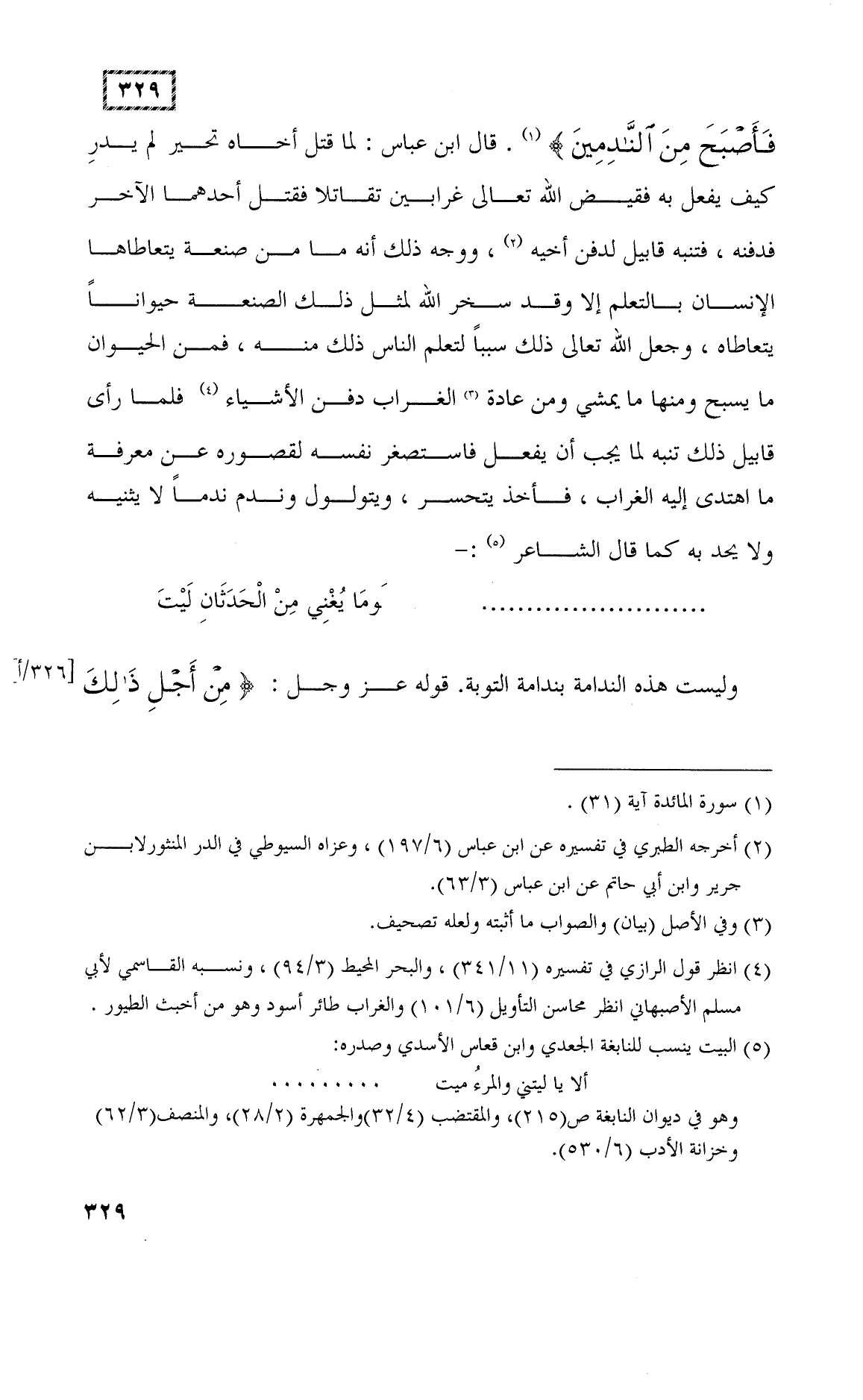 ووجه ذلك أنه ما من صنعة يتعاطاها الإنسان بالتعلم إلا وقد سخر الله لمثل ذلك الصنعة حيوانا يتعاطاه، وجعل الله تعالى ذلك سبباً لتعلم الناس ذلك منه، فمن الحيوان ما يسبح ومنها ما يمشي ومن عادة الغراب دفن الأشياء فلما رأى قابيل ذلك تنبه لما يجب أن يفعل فاستصغر نفسه لقصوره عن معرفة