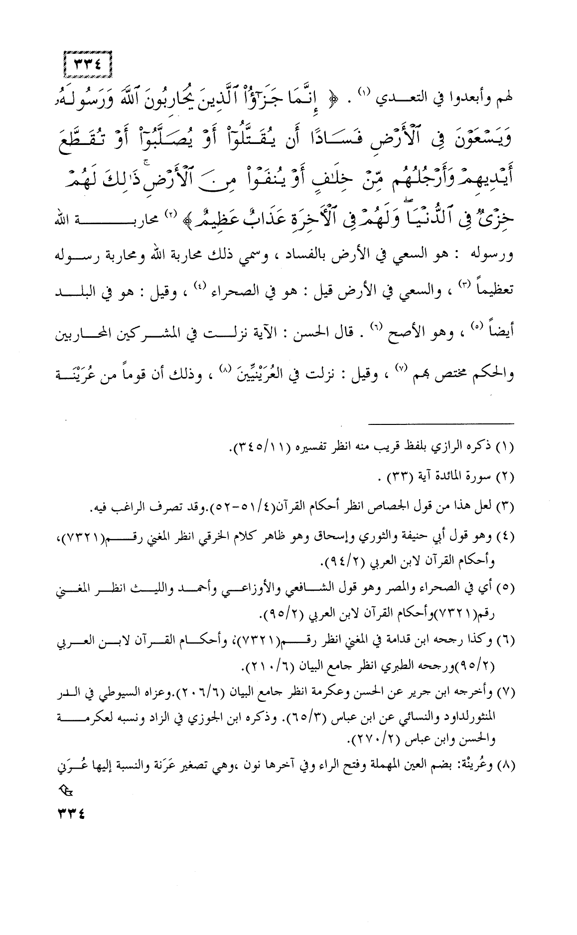 (إِنَّمَا جَزَاءُ الَّذِينَ يُحَارِبُونَ اللَّهَ وَرَسُولَهُ وَيَسْعَوْنَ فِي الْأَرْضِ فَسَادًا أَنْ يُقَتَّلُوا أَوْ يُصَلَّبُوا أَوْ تُقَطَّعَ أَيْدِيهِمْ وَأَرْجُلُهُمْ مِنْ خِلَافٍ أَوْ يُنْفَوْا مِنَ الْأَرْضِ ذَلِكَ لَهُمْ خِزْيٌ فِي الدُّنْيَا وَلَهُمْ فِي الْآخِرَةِ عَذَابٌ عَظِيمٌ (33)