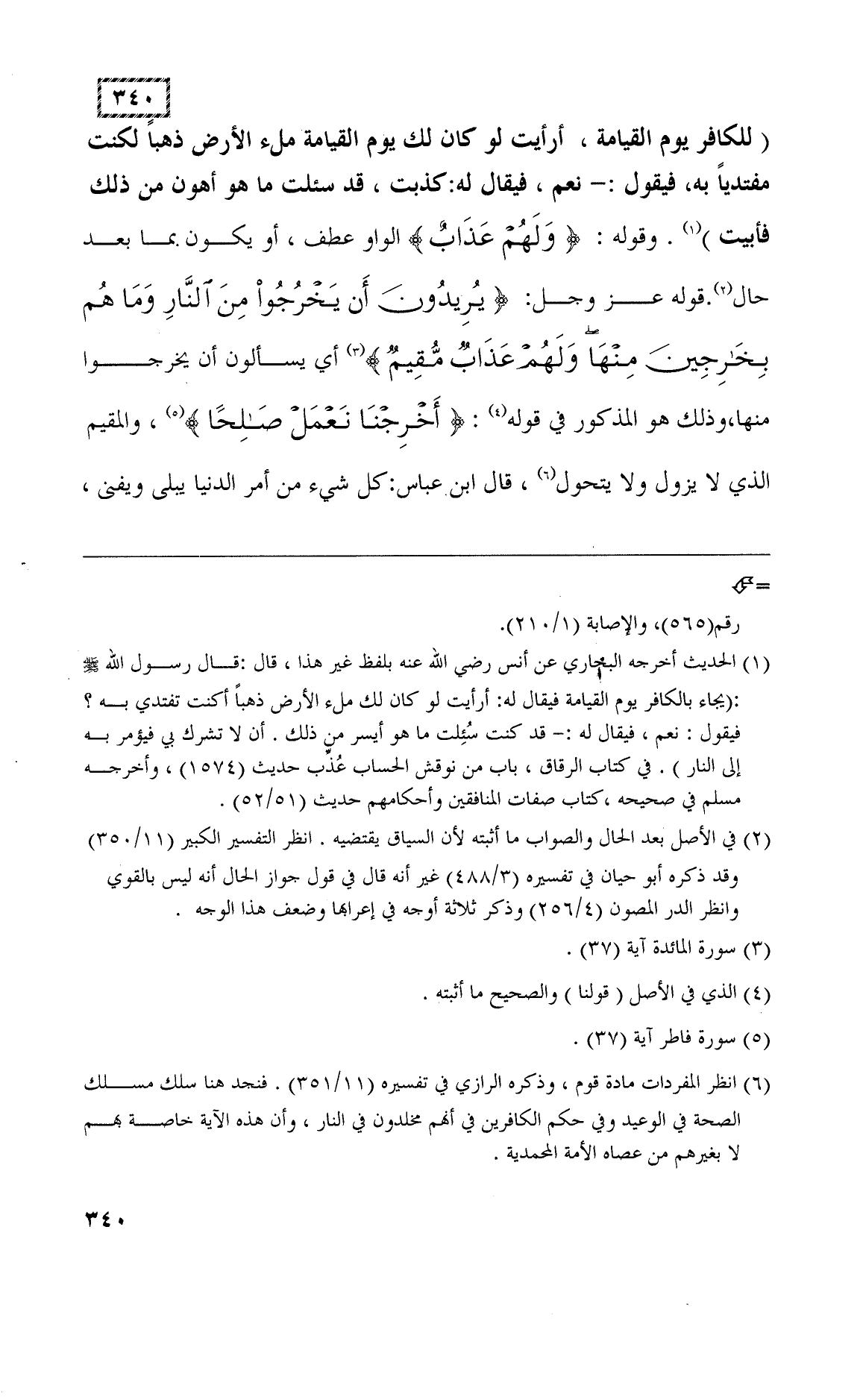 " يُجَاءُ بِالْكَافِرِ يَوْمَ الْقِيَامَةِ فَيُقَالُ لَهُ أَرَأَيْتَ لَوْ كَانَ لَكَ مِلْءُ الْأَرْضِ ذَهَبًا أَكُنْتَ تَفْتَدِي بِهِ فَيَقُولُ نَعَمْ فَيُقَالُ لَهُ قَدْ كُنْتَ سُئِلْتَ مَا هُوَ أَيْسَرُ مِنْ ذَلِكَ ".