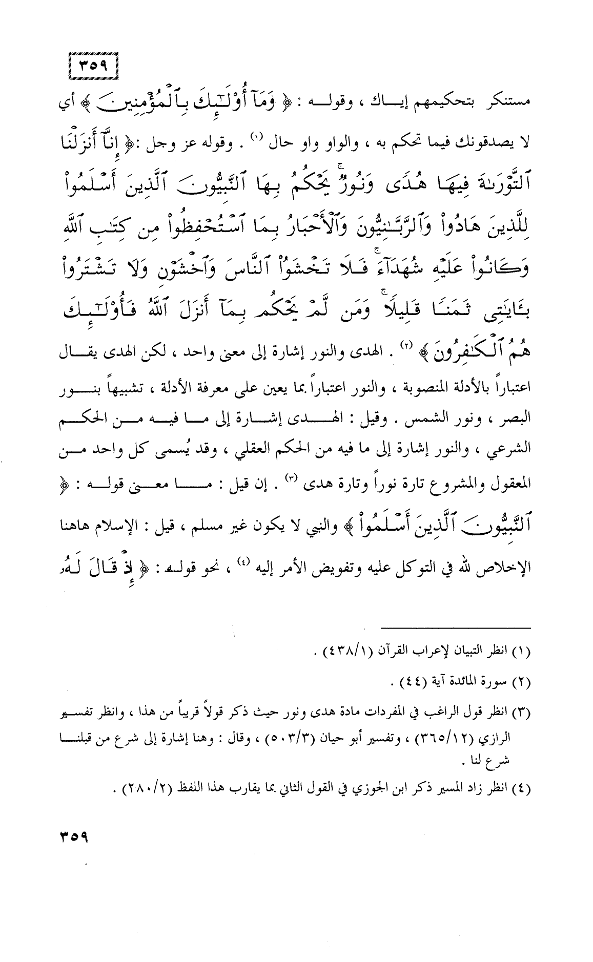 وقوله عز وجل: (إِنَّا أَنْزَلْنَا التَّوْرَاةَ فِيهَا هُدًى وَنُورٌ يَحْكُمُ بِهَا النَّبِيُّونَ الَّذِينَ أَسْلَمُوا لِلَّذِينَ هَادُوا وَالرَّبَّانِيُّونَ وَالْأَحْبَارُ بِمَا اسْتُحْفِظُوا مِنْ كِتَابِ اللَّهِ وَكَانُوا عَلَيْهِ شُهَدَاءَ فَلَا تَخْشَوُا النَّاسَ وَاخْشَوْنِ وَلَا تَشْتَرُوا بِآيَاتِي ثَمَنًا قَلِيلًا وَمَنْ لَمْ يَحْكُمْ بِمَا أَنْزَلَ اللَّهُ فَأُولَئِكَ هُمُ الْكَافِرُونَ (44)
