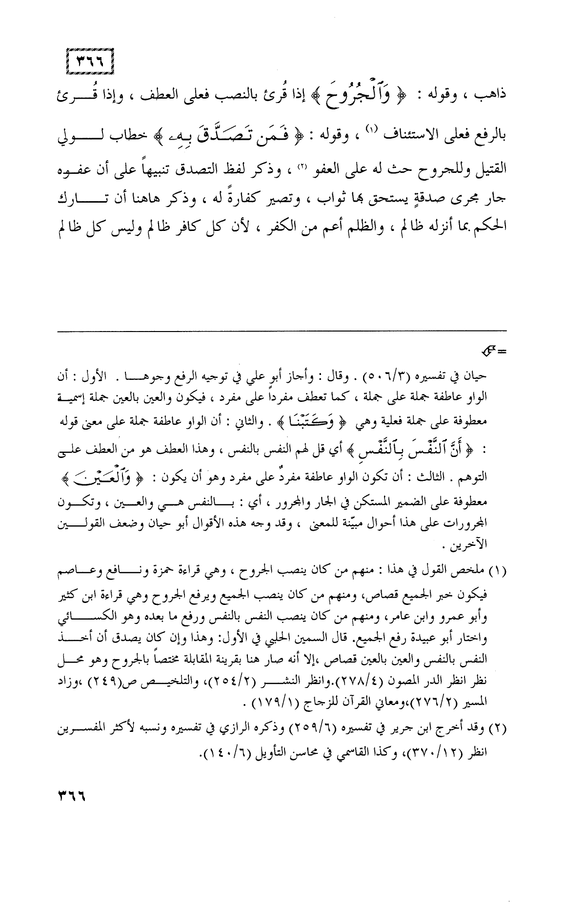 وقوله: (وَالْجُرُوحَ) إذا قُرئ بالنصب فعلى العطف، وإذا قُرئ