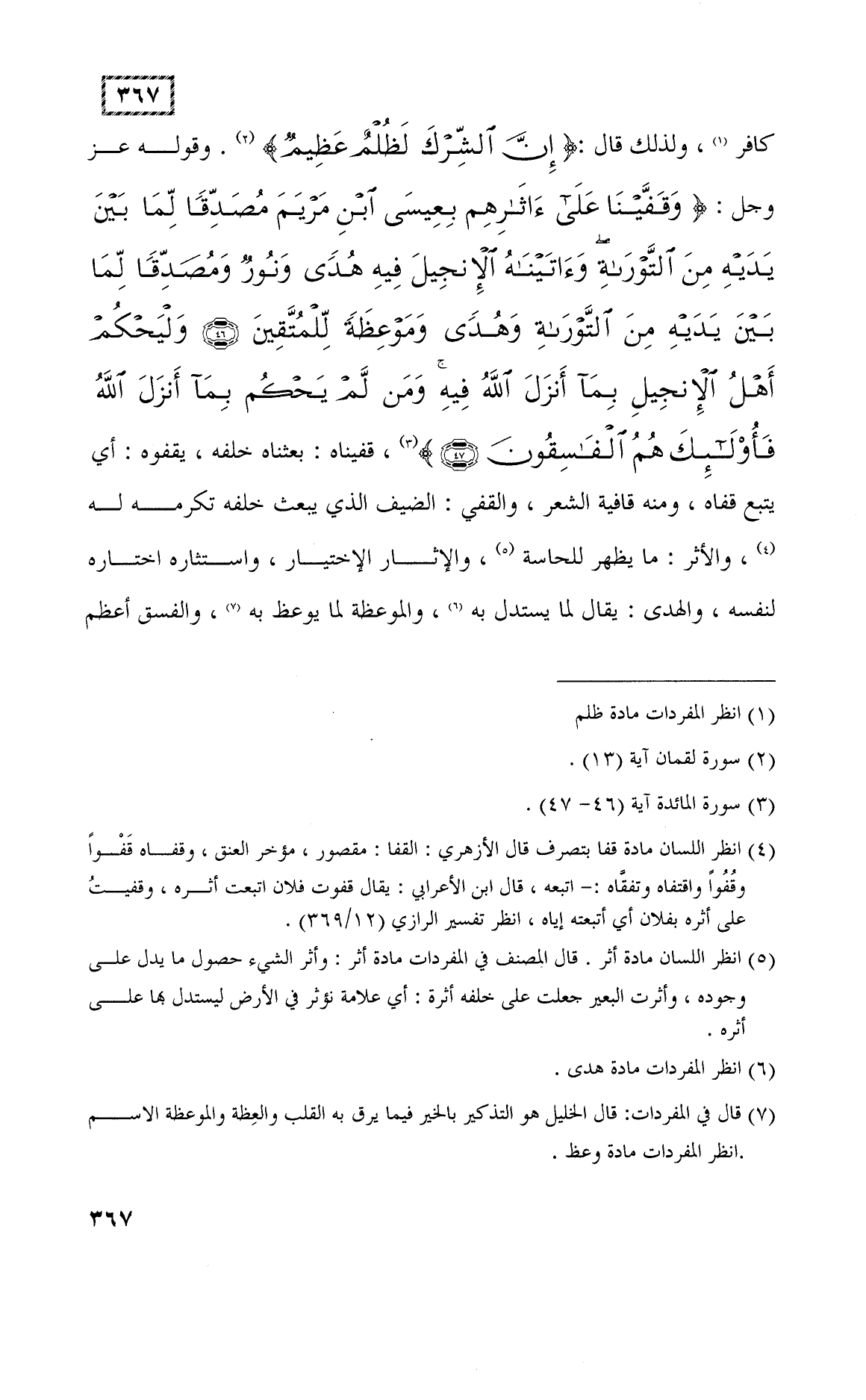 وقوله عز وجل: (وَقَفَّيْنَا عَلَى آثَارِهِمْ بِعِيسَى ابْنِ مَرْيَمَ مُصَدِّقًا لِمَا بَيْنَ يَدَيْهِ مِنَ التَّوْرَاةِ وَآتَيْنَاهُ الْإِنْجِيلَ فِيهِ هُدًى وَنُورٌ وَمُصَدِّقًا لِمَا بَيْنَ يَدَيْهِ مِنَ التَّوْرَاةِ وَهُدًى وَمَوْعِظَةً لِلْمُتَّقِينَ (46) وَلْيَحْكُمْ أَهْلُ الْإِنْجِيلِ بِمَا أَنْزَلَ اللَّهُ فِيهِ وَمَنْ لَمْ يَحْكُمْ بِمَا أَنْزَلَ اللَّهُ فَأُولَئِكَ هُمُ الْفَاسِقُونَ (47)