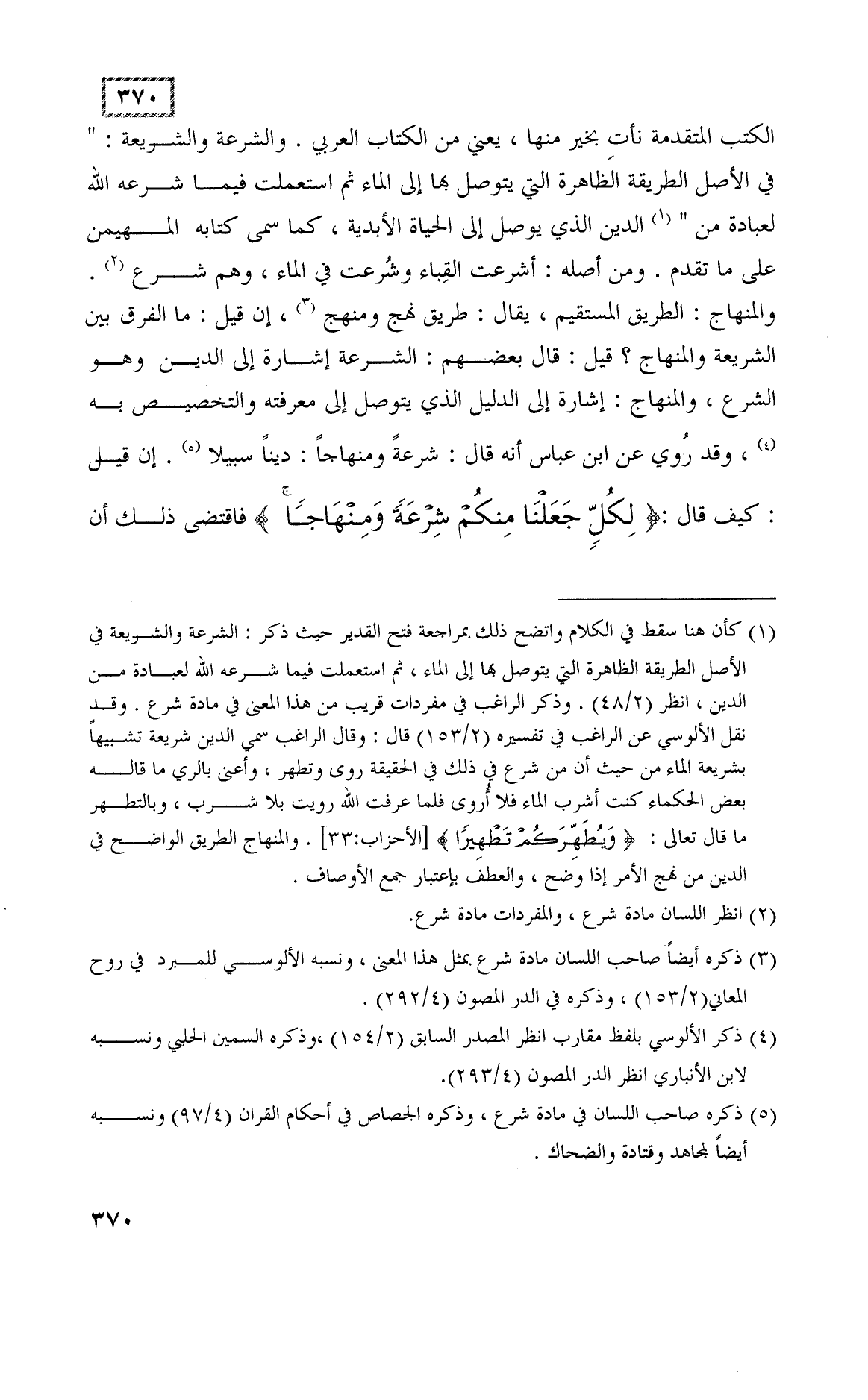 (1) كأن هنا سقط في الكلام واتضح ذلك بمراجعة فتح القدير حيث ذكر: الشرعة والشريعة في الأصل الطريقة الظاهرة التي يتوصل بها إلى الماء، ثم استعملت فيما شرعه الله لعبادة من الدين، انظر (2 لم 48). وذكر الراغب في مفرداته قريبا من هذا المعنى في مادة شرع.