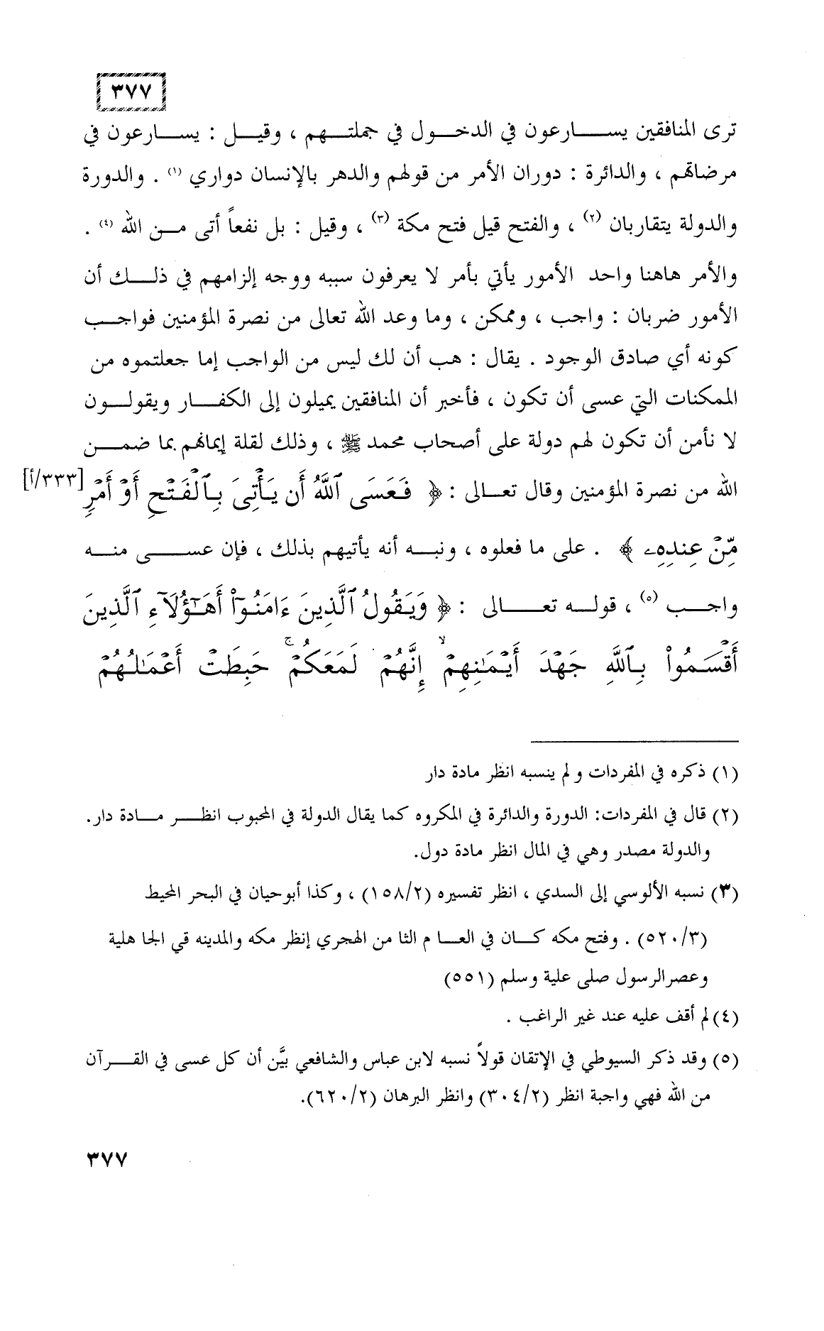 والأمر هاهنا واحد الأمور يأتي بأمر لا يعرفون سببه ووجه إلزامهم في ذلك أن الأمور ضربان: واجب، وممكن، وما وعد الله تعالى من نصرة المؤمنين فواجب كونه أي صادق الوجود. يقال: هب أن لك ليس من الواجب إما جعلتموه من الممكنات التي عسى أن تكون، فأخبر أن المنافقين يميلون إلى الكفار ويقولون لا نأمن أن تكون لهم دولة على أصحاب محمد - صلى الله عليه وسلم -، وذلك لقلة إيمانهم بما ضمن الله من نصرة المؤمنين وقال تعالى: (فَعَسَى اللَّهُ أَنْ يَأْتِيَ بِالْفَتْحِ أَوْ أَمْرٍ مِنْ عِنْدِهِ) على ما فعلوه، ونبه أنه يأتيهم بذلك، فإن عسى منه واجب.