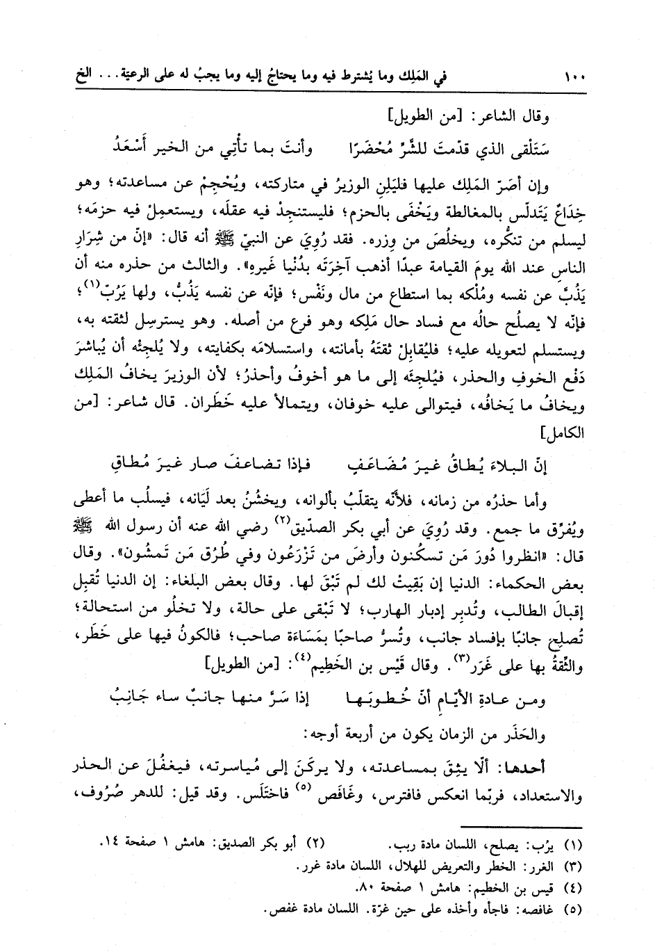 والحذر من الزمان يكون من أربعة أوجه : أحدها : ألاّ يثق بمساعدته ، ولا يركن إلى مياسرته ، فيغفل عن الحذر والاستعداد ، فربما انعكس فافترس ، وغافص فاختلس .