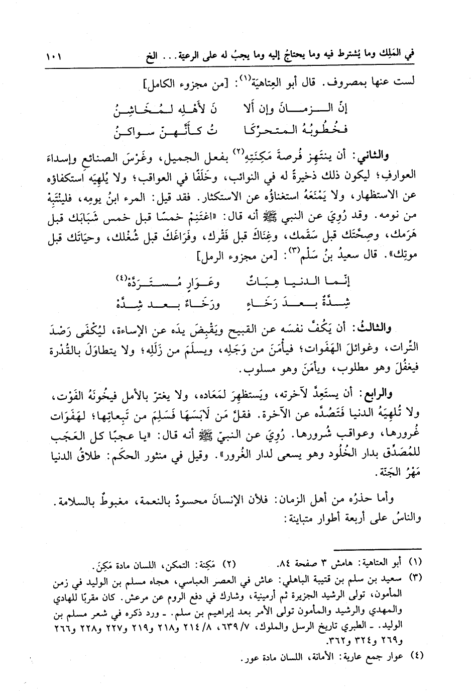 فخطوبه المتحركا . . . ت كأنهنّ سواكن والثاني : أن ينتهز فرصة مكنته بفعل الجميل ، وغرس الصنائع ، وإسداء العوارف ؛ ليكون ذلك ذخيرةً له في النوائب ، وخلفاً في العواقب ؛ ولا يلهيه استكفاؤه عن الاستظهار ، ولا يمنعه استغناؤه عن الاستكثار .