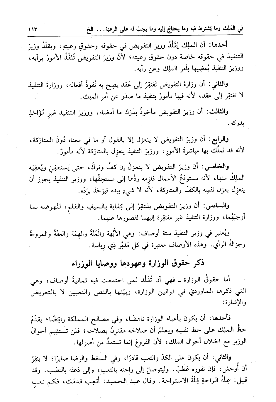 ويعتبر في وزير التنفيذ ستة أوصاف : وهي الأبهة والمنة والهمة والعفة والمروءة وجزالة الرأي .