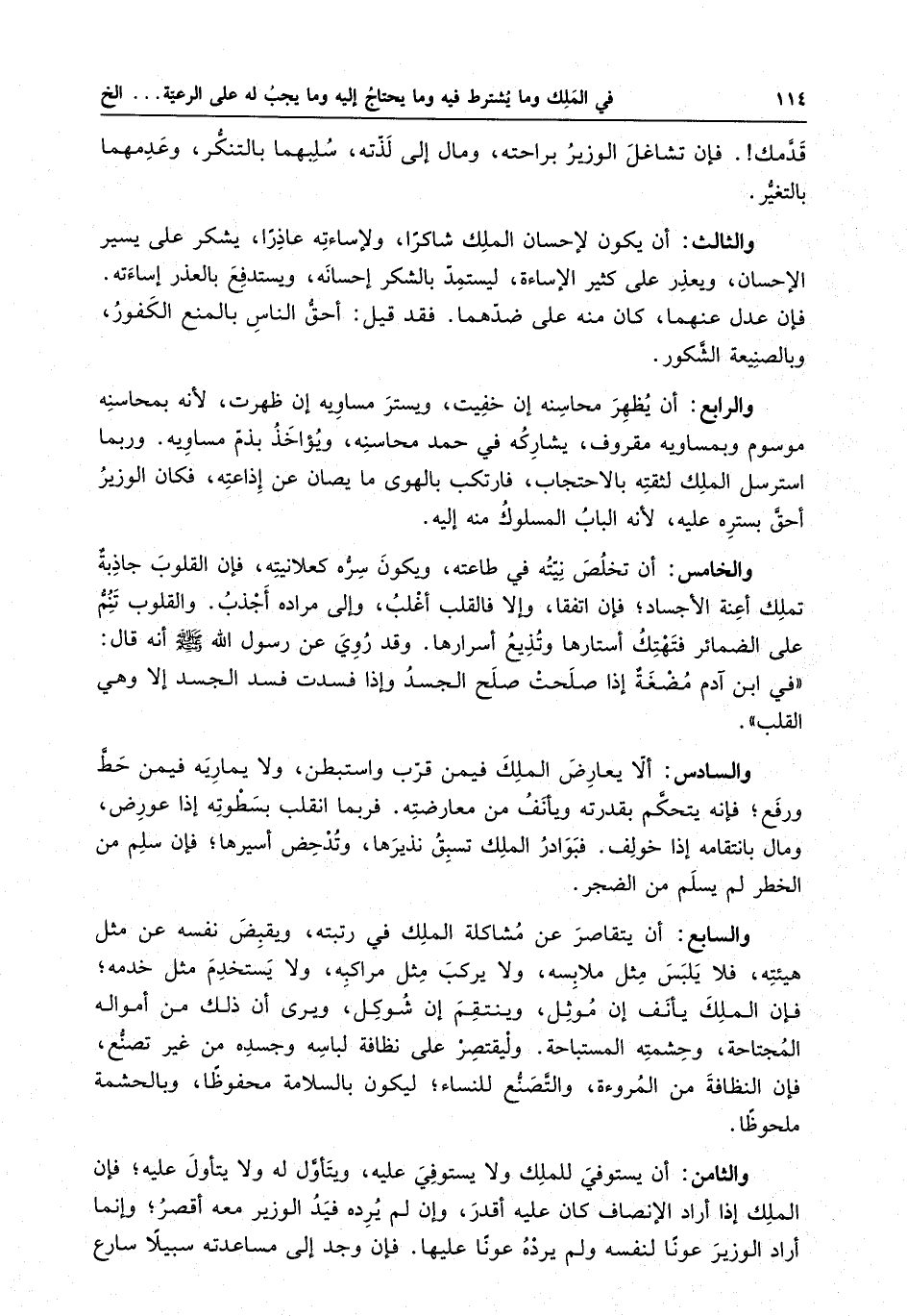 وربما استرسل الملك لثقته بالاحتجاب ، فارتكب بالهوى ما يصان عن إذاعته ، فكان الوزير أحق بستره عليه ، لأنه الباب المسلوك منه إليه . والخامس : أن تخلص نيته في طاعته ، ويكون سره كعلانيته ، فإن القلوب جاذبة تملك أعنة الأجساد ؛ فإن اتفقا ، وإلا فالقلب أغلب ، وإلى مراده أجذب .