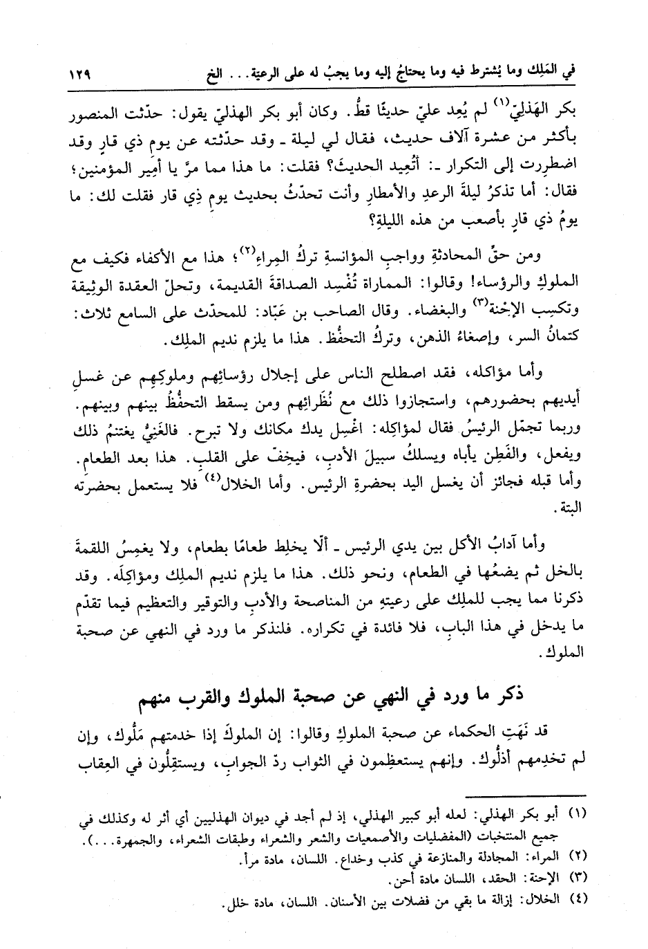 وكان أبو بكر الهذلي يقول : حدثت المنصور بأكثر من عشرة آلاف حديث ، فقال لي ليلة - وقد حدثته عن يوم ذي قارٍ وقد اضطررت إلى التكرار - : أتعيد الحديث ؟ فقلت : ما هذا مما مر يا أمير المؤمنين ؛ فقال : أما تذكر ليلة الرعد والأمطار وأنت تحدث بحديث يوم ذي قار فقلت لك : ما يوم ذي قارٍ بأصعب من هذه الليلة ؟ ومن حق المحادثة وواجب المؤانسة ترك المراء ؛ هذا مع الأكفاء فكيف مع الملوك والرؤساء وقالوا : المماراة تفسد الصداقة القديمة ، وتحل العقدة الوثيقة وتكسب الإحنة والبغضاء .