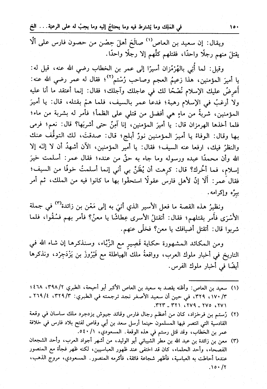 ويقال : إن سعيد بن العاص صالح أهل حصن من حصون فارس على ألا يقتل منهم رجلاً واحداً ، فقتلهم كلهم إلا رجلاً واحداً . وقيل : لما أتي بالهرمزان أسيراً إلى عمر بن الخطاب رضي الله عنه ، قيل له : يا أمير المؤمنين ، هذا زعيم العجم وصاحب رستم ، فقال له عمر رضي الله عنه : أعرض عليك الإسلام نصحاً لك في عاجلك وآجلك ؛ فقال : إنما أعتقد ما أنا عليه ولا أرغب في الإسلام رهبة ؛ فدعا عمر بالسيف ، فلما هم بقتله ، قال : يا أمير المؤمنين ، شربةٌ من ماءٍ هي أفضل من قتلي على الظمأ ؛ فأمر له بشربة من ماء ؛ فلما أخذها الهرمزان قال : يا أمير المؤمنين ، أنا آمنٌ حتى أشربها ؟ قال : نعم ؛ فرمى بها وقال : الوفاء يا أمير المؤمنين نورٌ أبلج ؛ قال : صدقت ، لك التوقف عنك والنظر فيك ، ارفعا عنه السيف ؛ فقال : يا أمير المؤمنين ، آلآن أشهد أن لا إله إلا الله وأن محمداً عبده ورسوله وما جاء به حق من عنده ؛ فقال عمر : أسلمت خير إسلام ، فما أخرك ؟ قال : كرهت أن يظن بي أني أسلمت خوفاً من السيف ؛ فقال عمر : ألا لأهل فارس عقولاً استحقوا بها ما كانوا فيه من الملك ، ثم أمر ببره وإكرامه .