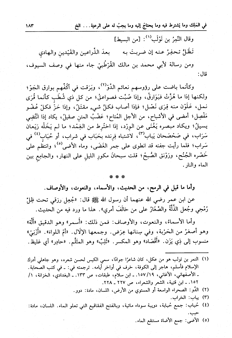 ومن رسالة لأبي محمد بن مالك القرطبي جاء منها في وصف السيوف ، قال : وكأنما باضت على رءوسهم نعائم الدر ، وبرقت في أكفهم بوارق الجو ، ولكنها إذا ما هزت فبوارق ، وإذا صبت فصواعق ؛ من كل ذي شطبٍ كأنما قرى نمل ، علون منه قرى نصل ؛ فإذا أصاب فكل شيء مقتل ، وإذا حز فكل عضو مفصل ؛ أمضى في الأشباح ، من الأجل المتاح ؛ عصب المتن ثقيل ، يكاد إذا انتضي يسيل ؛ ويكاد مبصره يغنى عن الورد ، إذا أختر من الغمد ؛ ما لم يخله ريعان سراب ، في تصحصحان يباب ، لاشتباه فرند بأحباب في شراب ، أو أحباب في سراب ؛ فلما رأيت جفنه قد انطوى على جمر الغضى ، وماء الأضى ؛ وانتظم على خصره الجنح ، ورونق الصبح ؛ قلت سبحان مكور الليل على النهار ، والجامع بين الماء والنار .