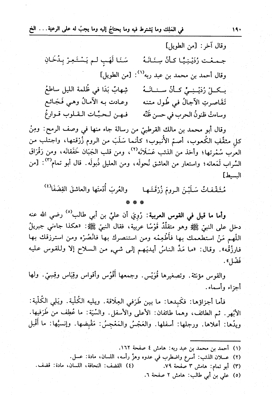 وقال أبو محمد بن مالك قرطبي من رسالة جاء منها في وصف الرمح : ومن كل مثقف الكعوب ، أصم الأنبوب ؛ كأنما سلب من الروم زرقتها ، واجتلب من العرب سمرتها ؛ وأخذ من الذئب عسلانه ، ومن القلب الجبان خفقانه ، ومن رقراق السراب لمعانه ؛ واستعار من العاشق نحوله ، ومن العليل .