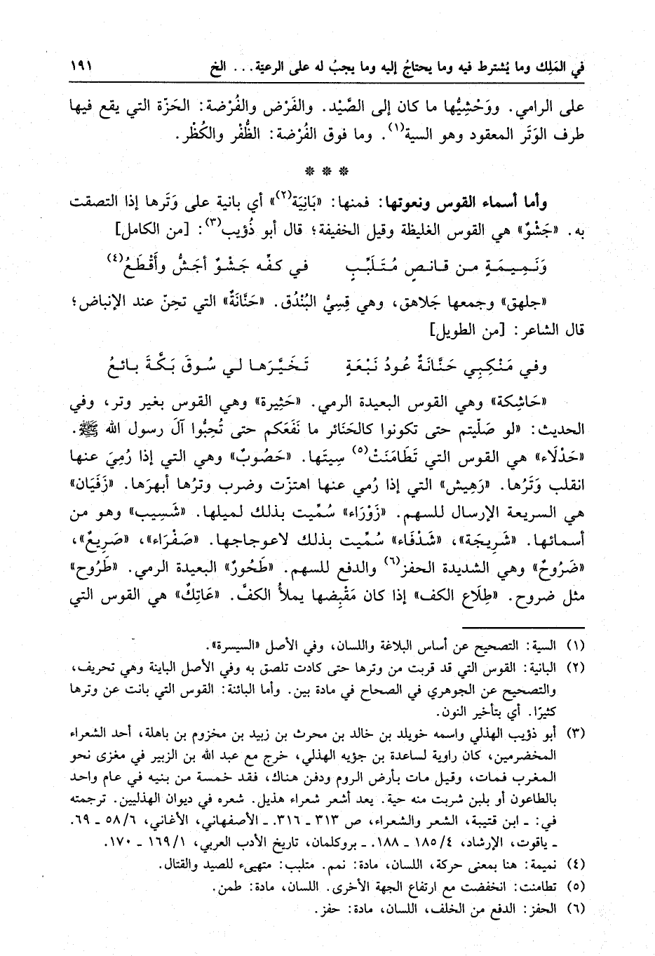 وفي منكبي حنانةٌ عود نبعةٍ . . . تخيرها لي سوق بكة بائع " حاشكة " وهي القوس البعيدة الرمي . " حنيرة " وهي القوس بغير وتر ، وفي الحديث : " لو صليتم حتى تكونوا كالحنائر ما نفعكم حتى تحبوا آل رسول الله ( صلى الله عليه وسلم ) " . " حدلاء " هي القوس التي تطامنت سيتها . " حصوبٌ " وهي التي إذا رمي عنها انقلب وترها . " رهيش " التي إذا رمي عنها اهتزت وضرب وترها أبهرها . " زفيان " هي السريعة الإرسال للسهم . " زوراء " سميت بذلك لميلها . " شسيب " وهو من أسمائها . " شريحة " . " شدفاء " سميت بذلك لاعوجاجها . " صفراء " . " صريعٌ " . " ضروحٌ " وهي الشديدة الخفر والدفع للسهم . " طحورٌ " البعيدة الرمي . " طروحٌ " مثل ضروح . " طلاع الكف " إذا كان مقبضها يملأ الكف . " عاتكٌ " هي القوس التي