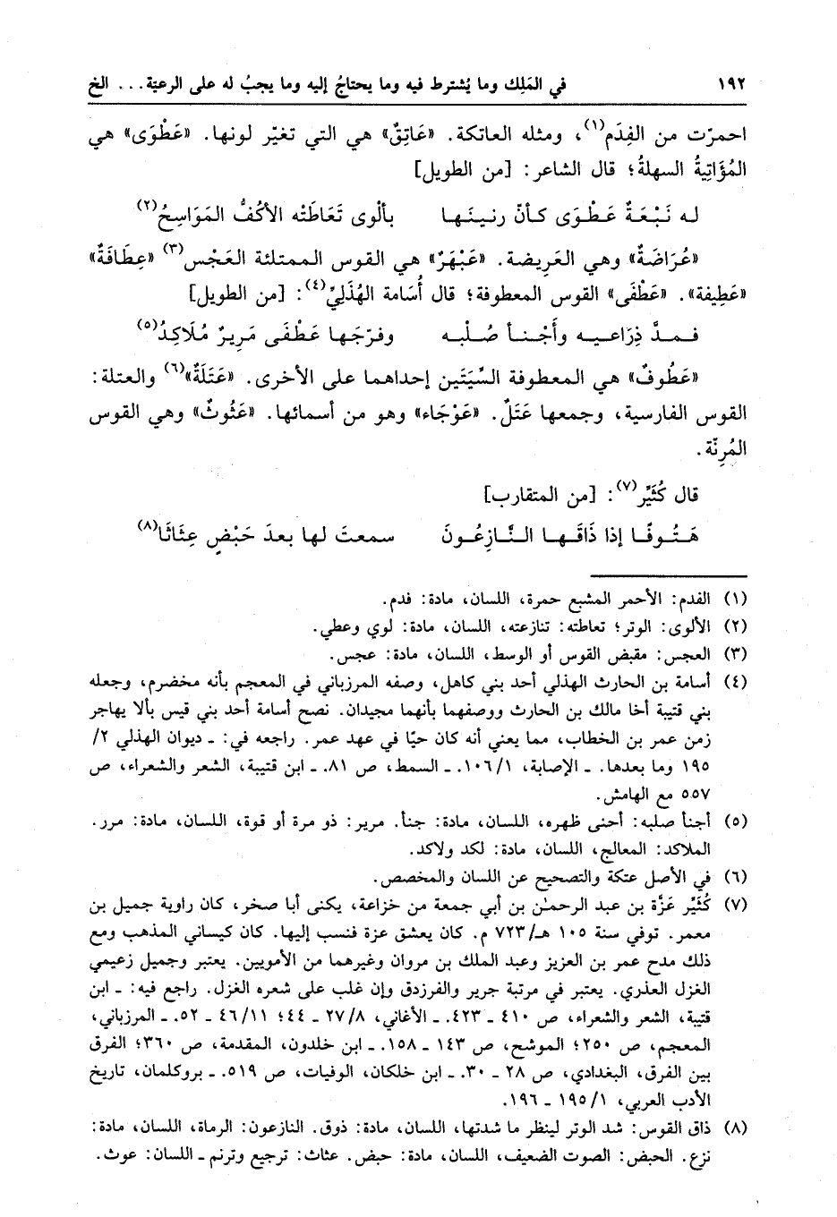 " عراضةٌ " وهي العريضة . " عبهرٌ " هي القوي الممتلئة العجس . " عطافةٌ " . " عطيفةٌ " . " عطفى " القوس المعطوفة ؛ قال أسامة الهذلي :