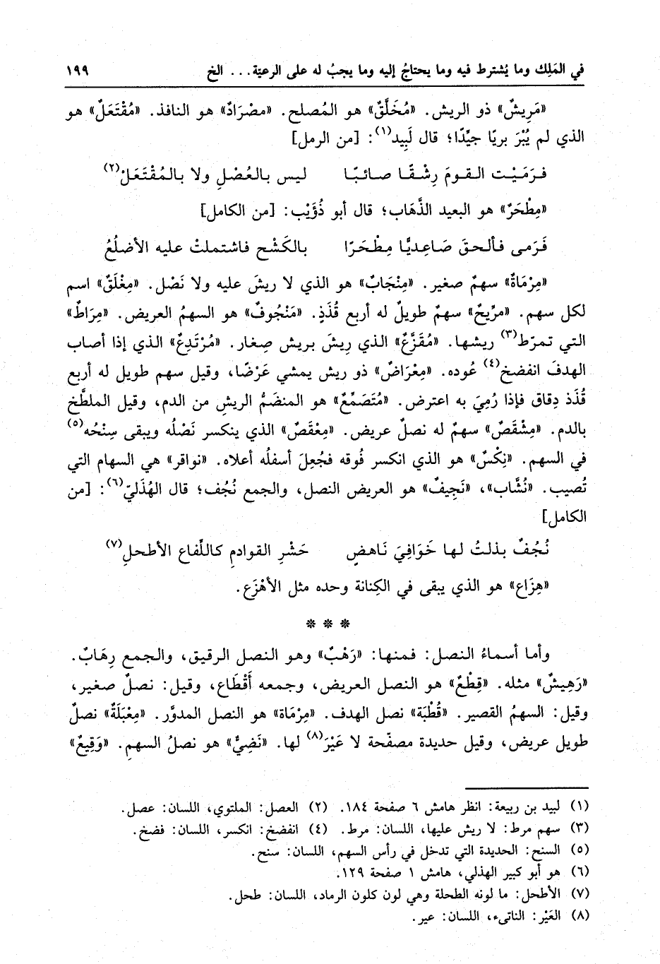 " مريشٌ " ذو الريش . " مخلقٌ " هو المصلح . " مصرادٌ " هو النافذ . " مقتعلٌ " هو الذي لم يبر برياً جيداً ؛ قال لبيد :