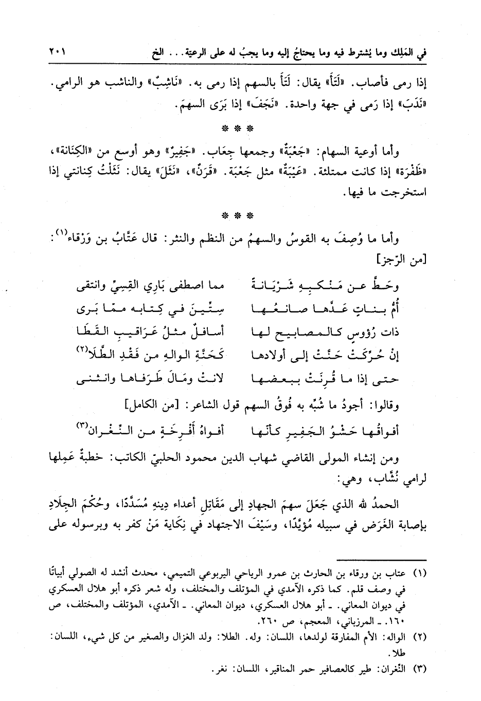 إذا رمى فأصاب . " لتأ " يقال : لتأ بالسهم إذا رمى به . " ناشبٌ " والناشب هو الرامي . " ندب " إذا رمى في جهة واحدة . " نجف " إذا برى السهم .