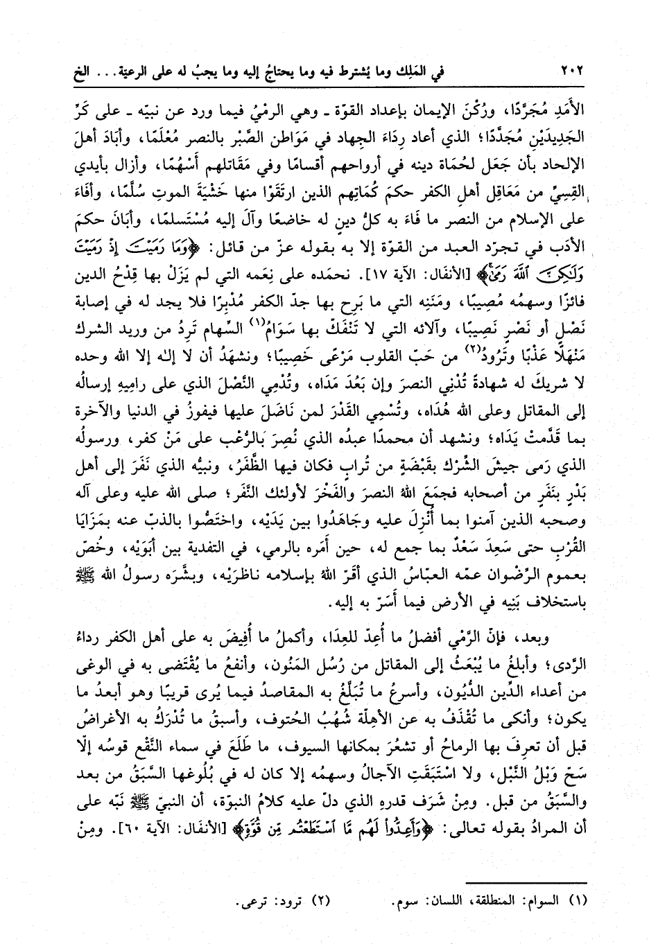 الأمد مجردا ، وركن الإيمان بإعداد القوة وهي الرمي فيما ورد عن نبيه على كر الجديدين مجددا ؛ الذي أعاد رداء الجهاد في مواطن الصبر بالنصر معلماً ، وأباد أهل الإلحاد بأن جعل لحماة دينه في أرواحهم أقساما وفي مقاتلهم أسهما ، وأزال بأيدي القسي من معاقل أهل الكفر حكم كماتهم الذين ارتقوا منها خشية الموت سلما ، وأفاء على الإسلام من النصر ما فاء به كل دينٍ له خاضعاً وآل إليه مستسلما ، وأبان حكم الأدب في تجرد العبد من القوة إلا به بقوله عز من قائل : " وما رميت إذ رميت ولكن الله رمى " . نحمده على نعمه التي لم يزل بها قدح الدين فائزاً وسهمه مصيبا ، ومننه التي ما برح بها جد الكفر مدبراً فلا يجد له في إصابة نصلٍ أو نصرٍ نصيبا ، وآلائه التي لا تنفك بها سوام السهام ترد من وريد الشرك منهلاً عذباً وترود من حب القلوب مرعىً خصيبا ، ونشهد أن لا إله إلا الله وحده لا شريك له شهادةً تدني النصر وإن بعد مداه ، وتدمي النصل الذي على راميه إرساله إلى المقاتل وعلى الله هداه ، وتسمي القدر لمن ناضل عليها فيفوز في الدنيا والآخرة بما قدمت يداه ؛ ونشهد أن محمداً عبده الذي نصر بالرعب على من كفر ، ورسوله الذي رمى جيش الشرك بقبضةٍ من تراب فكان فيها الظفر ، ونبيه الذي نفر إلى أهل بدرٍ بنفرٍ من أصحابه فجمع الله النصر والفخر لأولئك النفر ؛ صلى الله عليه وعلى آله وصحبه الذين آمنوا بما أنزل عليه وجاهدوا بين يديهن واختصوا بالذب عنه بمزايا القرب حتى سعد سعدٌ بما جمع له ، حين أمره بالرمي ، في التفدية بين أبويه ، وخص بعموم الرضوان عمه العباس الذي أقر الله بإسلامه ناظريهن وبشره رسول الله ( صلى الله عليه وسلم ) باستخلاف بنيه في الأرض فيما أسر به إليه .