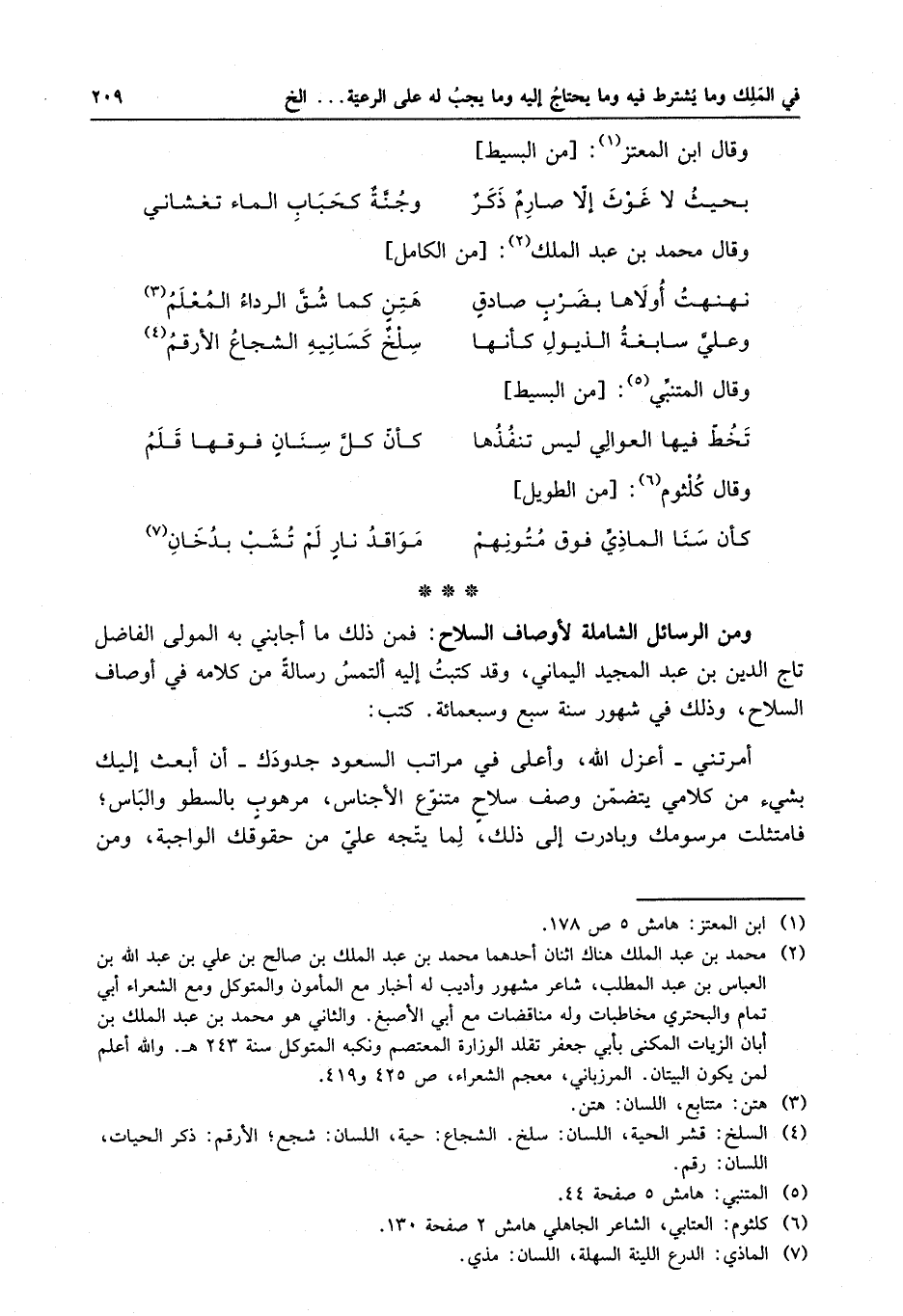 كتب : أمرتني أعزك الله ، وأعلى في مراتب السعود جدودك أن أبعث إليك بشيء من كلامي يتضمن وصف سلاحٍ متنوع الأجناس ، مرهوبٍ بالسطو والباس ؛ فامتثلت مرسومك وبادرت إلى ذلك ، لما يتجه علي من حقوقك الواجبة ، ومن