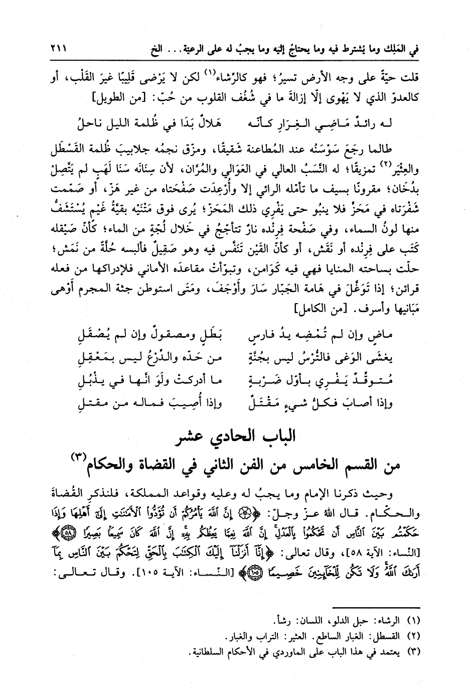 الباب الحادي العشر في القضاة والحكام وحيث ذكرنا الإمام وما يجب عليه وقواعد المملكة ، فلنذكر القضاة والحكام