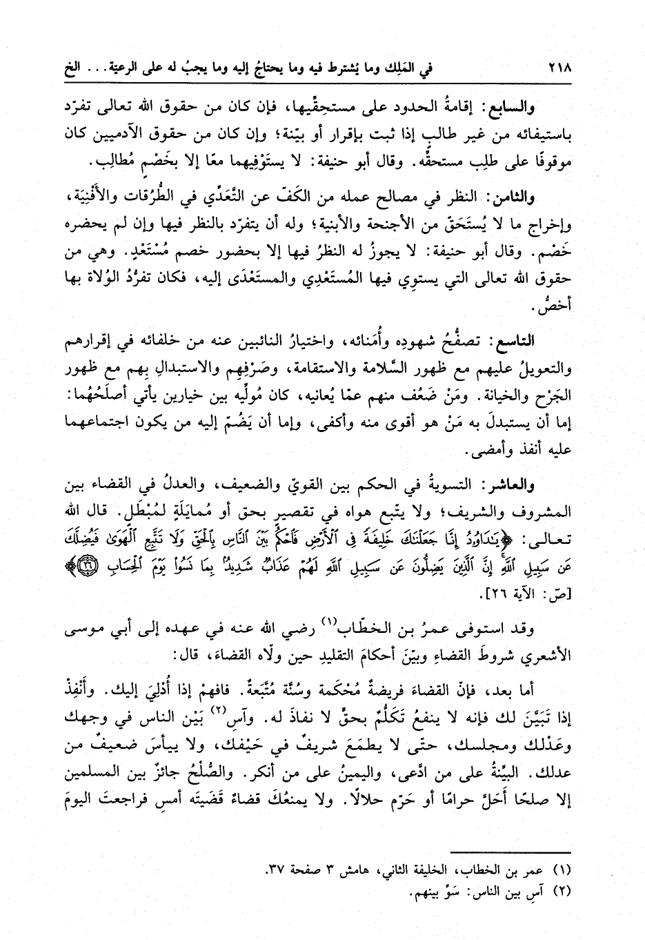 وقد استوفى عمر بن الخطاب رضي الله عنه في عهده إلى أبي موسى الأشعري شروط القضاء وبين أحكام التقليد حين ولاه القضاء ، قال : أما بعد ، فإن القضاء فريضةٌ محكمة وسنة متبعة .