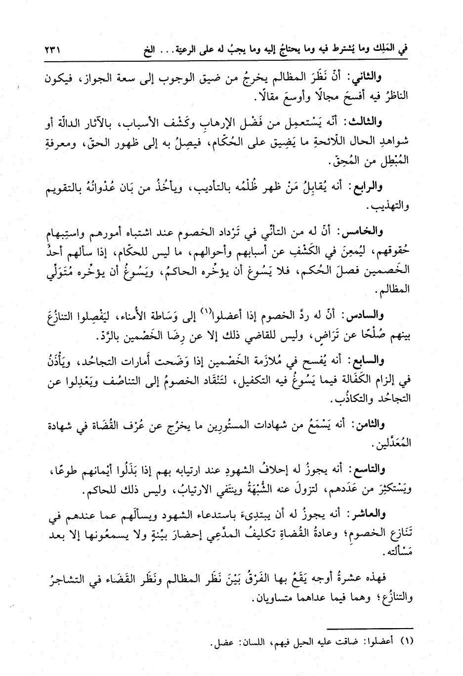 فهذه عشرة أوجه يقع فيها الفرق بين نظر المظالم ونظر القضاء في التشاجر والتنازع ؛ وهما فيما عداهما متساويان .