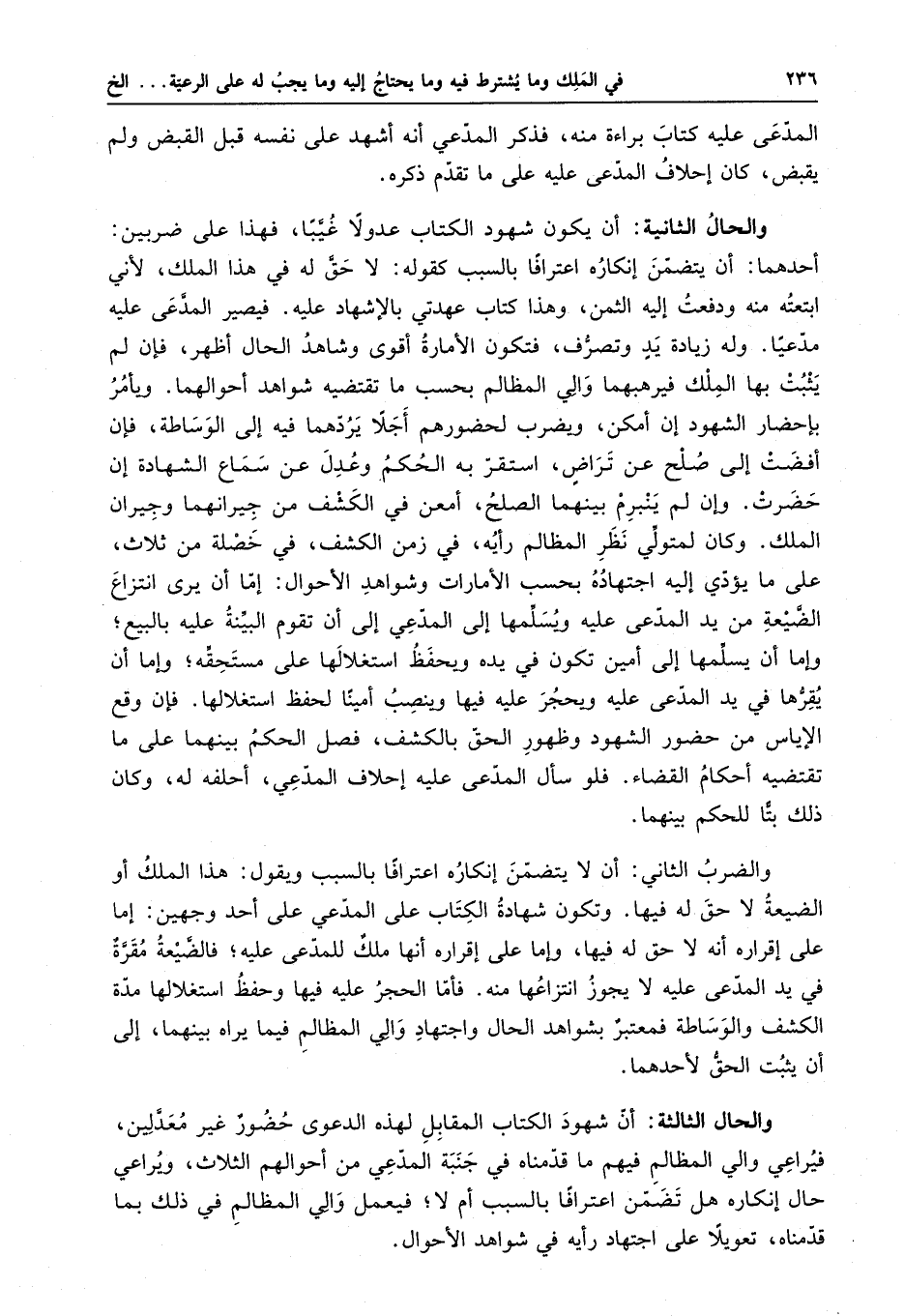 وكان لمتولي نظر المظالم رأيه ، في زمن الكشف ، في خصلة من ثلاث ، على ما يؤدي إليه اجتهاده بحسب الأمارات وشواهد الأحوال : إما أن يرى انتزاع الضيعة من يد المدعى عليه ويسلمها إلى المدعي إلى أن تقوم البينة عليه بالبيع ؛ وإما أن يسلمها إلى أمين تكون في يده ويحفظ استغلالها على مستحقه ؛ وإما أن يقرها في يد المدعى عليه ويحجر عليه فيها وينصب أميناً لحفظ استغلالها .