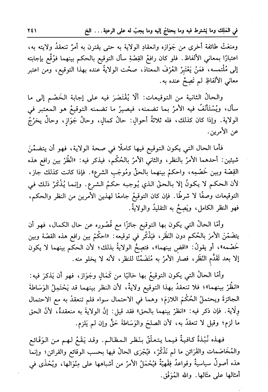 وأما الحال التي يكون التوقيع بها خالياً من كمالٍ وجواز ، فهو أن يذكر فيه : انظر بينهما ؛ فلا تنعقد بهذا التوقيع ولاية ، لأن النظر بينهما قد يحتمل الوساطة الجائزة ويحتمل الحكم اللازم ؛ وهما في الاحتمال سواء ، فلم تنعقد به مع الاحتمال ولاية .
