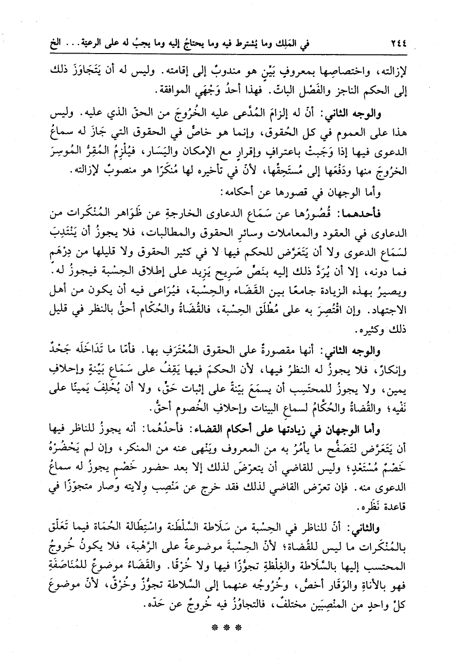 فأحدهما : قصورها عن سماع الدعاوى الخارجة عن ظواهر المنكرات من الدعاوى في العقود والمعاملات وسائر الحقوق والمطالبات ، فلا يجوز أن ينتدب لسماع الدعوى ولا أن يتعرض للحكم فيها لا في كثير الحقوق ولا قليلها من درهمٍ فما دونه ، إلا أن يرد إليه ذلك بنصٍ صريح يزيد على إطلاق الحسبة فيجوز له .