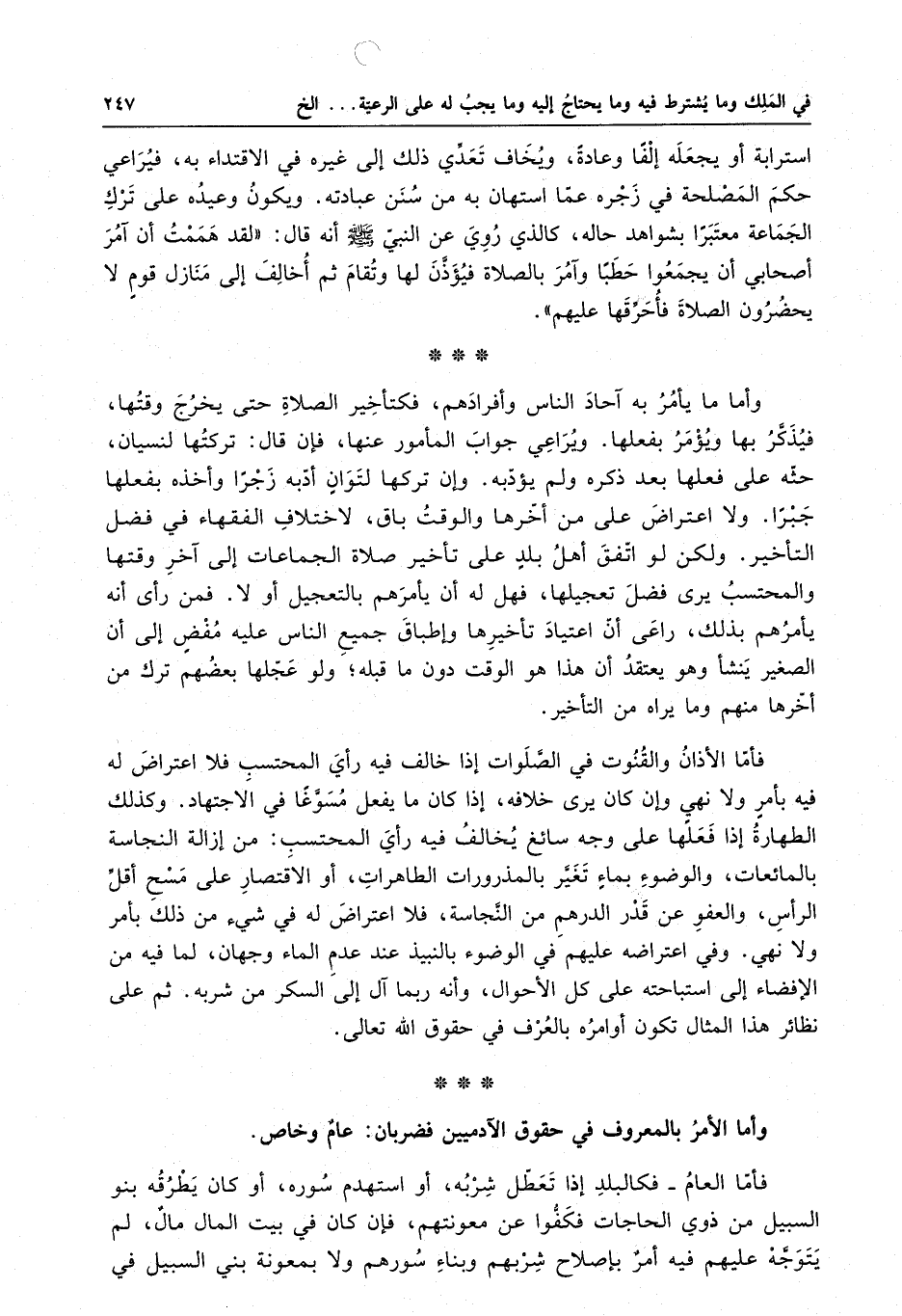 فمن رأى أنه يأمرهم بذلك ، راعى أن اعتياد تأخيرها وإطباق جميع الناس عليه مفضٍ إلى أن الصغير ينشأ وهو يعتقد أن هذا هو الوقت دون ما قبله ؛ ولو عجلها بعضهم ترك من آخرها منهم وما يراه من التأخير . فأما الأذان والقنوت في الصلوات إذا خالف فيه رأي المحتسب فلا اعتراض له فيه بأمرٍ ولا نهي وإن كان يرى خلافه ، إذا كان ما يفعل مسوغاً في الاجتهاد .