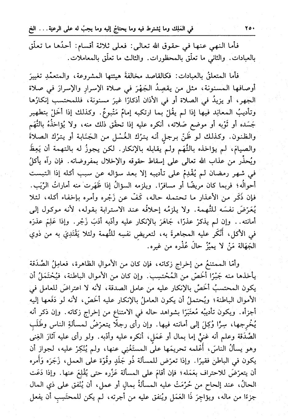 فأما المتعلق بالعبادات : فكالقاصد مخالفة هيئتها المشروعة ، والمتعمد تغيير أوصافها المسنونة ، مثل من يقصد الجهر في صلاة الإسرار والإسرار في صلاة الجهر ، أو يزيد في الصلاة أو في الأذان أذكاراً غير مسنونة ، فللمحتسب إنكارها وتأديب المعاند فيها إذا لم يقل بما ارتكبه إمامٌ متبوع .