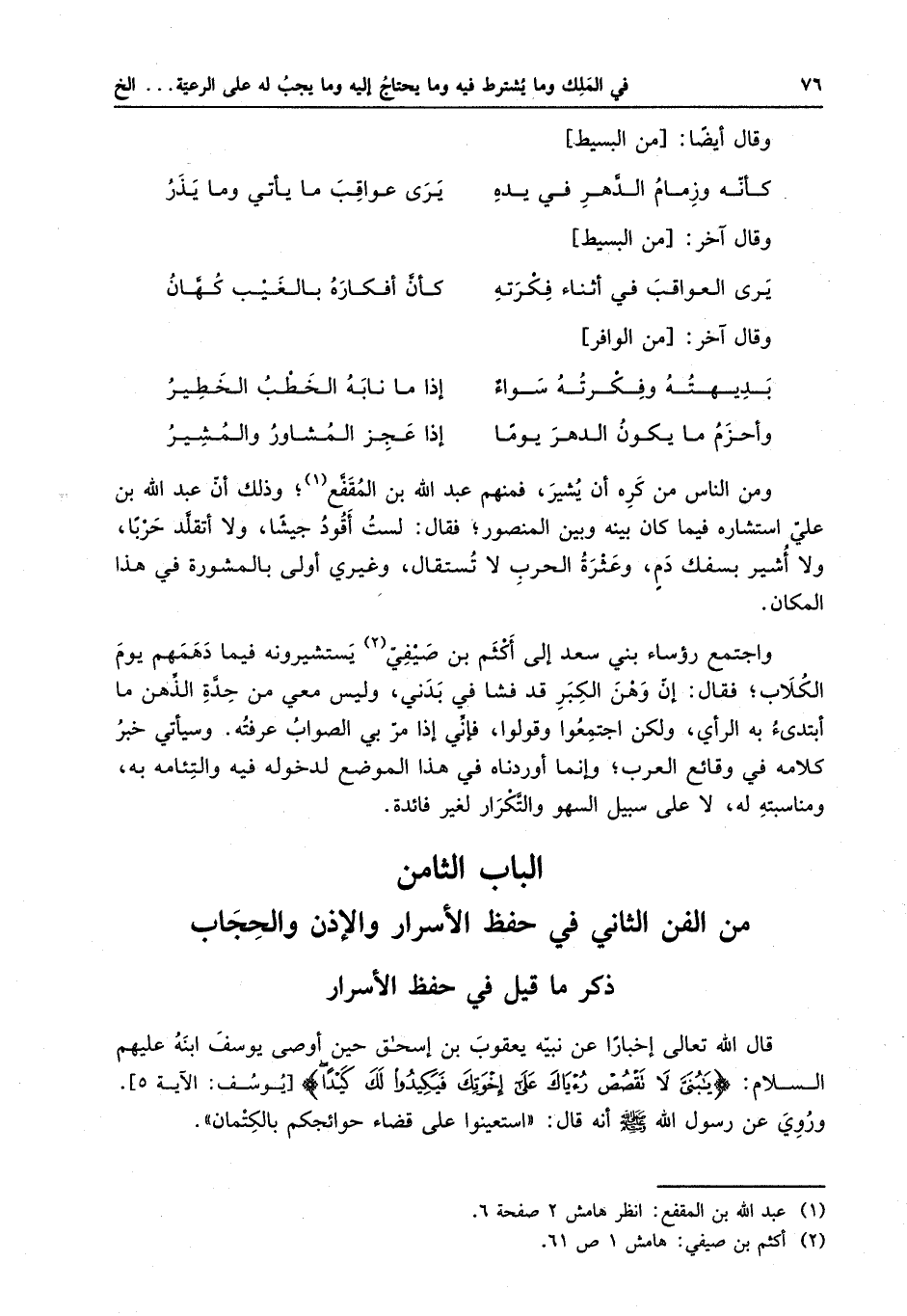 الباب الثامن من الفن الثامن في حفظ الأسرار والإذن والحجاب ما قيل في حفظ الأسرار